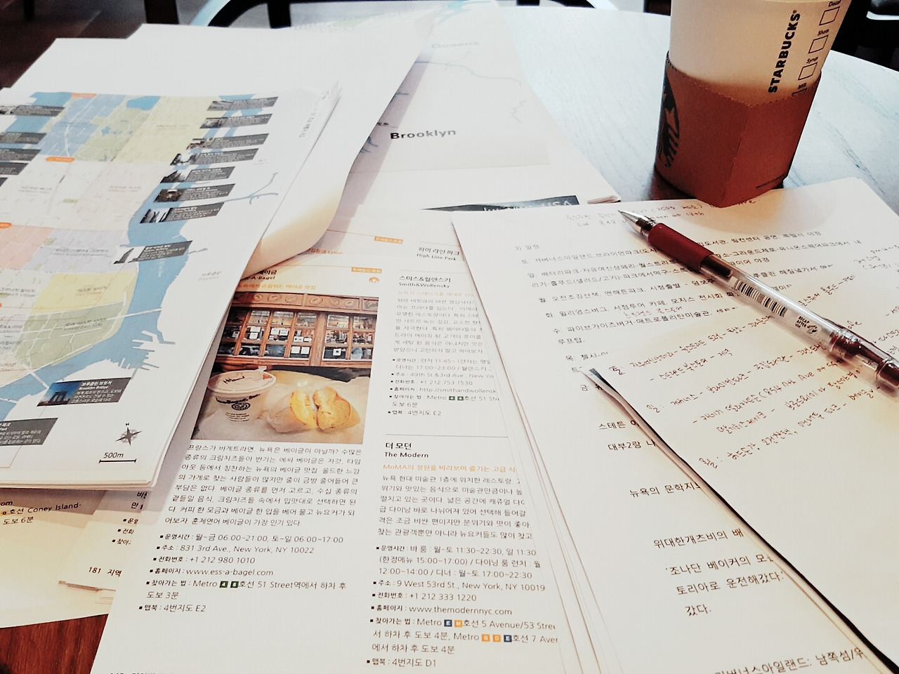 카페에서 옆자리에 앉은 그녀와의 대화, 그래서 스마트폰으로 뉴욕에서 가보고 싶은 장소를 함께 보는 순간, 내 뒤를 졸졸 쫓아오는 강아지를 쓰다듬는 시간, 쿠키가게에 길게 늘어선 줄에 나도 괜히 끼어본다거나, 누군가의 앞마당에서 열린 작은 시장을 우연히 만나는, 문득 지나치다가 앉아보고 싶은 공원을 발견하게 될 기회는 적혀있지 않으니까.