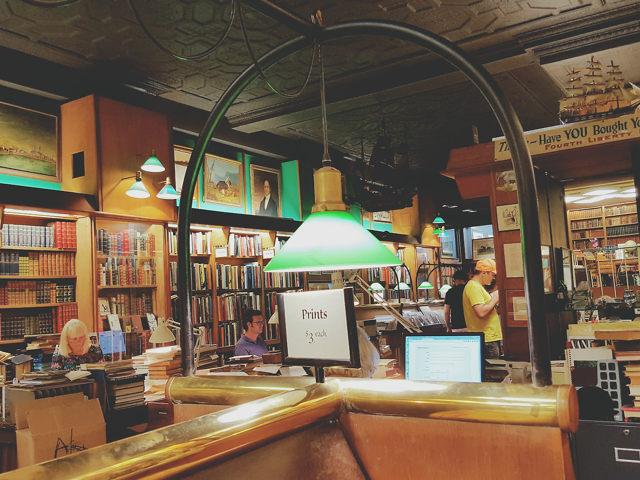 마치 내가 오래도록 상상해왔던 '서점'이란 아마 이런 곳 일거라고. 오래된 책들이 정성스럽게 놓여있고, 그보다 더 오래됐음직한 팩들에서 잘라낸 예쁜 프린팅이 전시된, 아마도 백 년도 전의 지도들이 벽에 걸려있으며, 초록색 갓을 쓴 노란 조명 아래 타닥타닥 타자를 치고 있는 직원들. 여기야, 내가 찾던 서점.