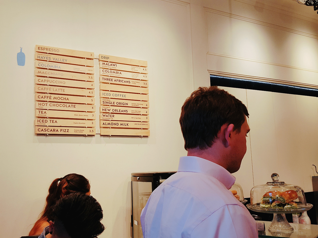 커피 한 잔을 맛보기까지 제법 시간도 걸릴뿐더러 내부 자리도 다소 좁은 블루보틀. 그러나 커피의 맛을 기대하며 즐겁게 줄을 선 곳. 블루보틀에서는 시그니처 메뉴인 ‘뉴올리언즈 커피’를 주문했다. 한국에서도 한창 유행하고 있는 콜드브루라떼처럼, 진한 커피에 고소한 유기농 우유가 듬뿍 들어간 메뉴! 라떼라면 언제나 옳다고 생각하는, 이 구역 라떼 덕후들이라면 당연히 품어보아할 커피.