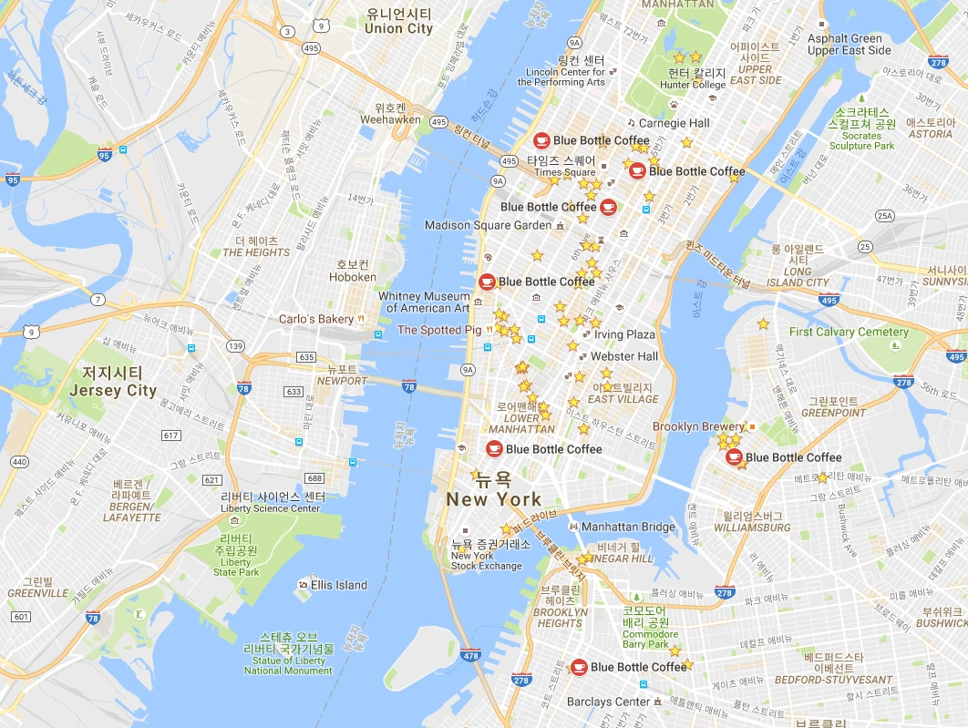 블루보틀 위치는 아래 지도를 확인하면 된다. 맨해튼에 5곳, 브루클린에 2곳이 있다.