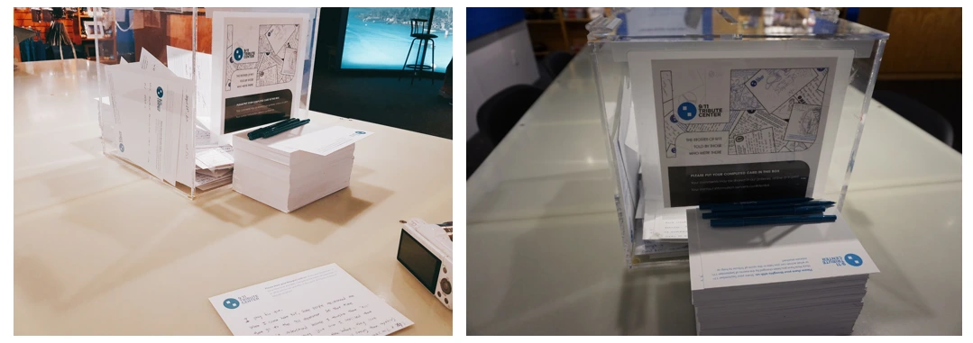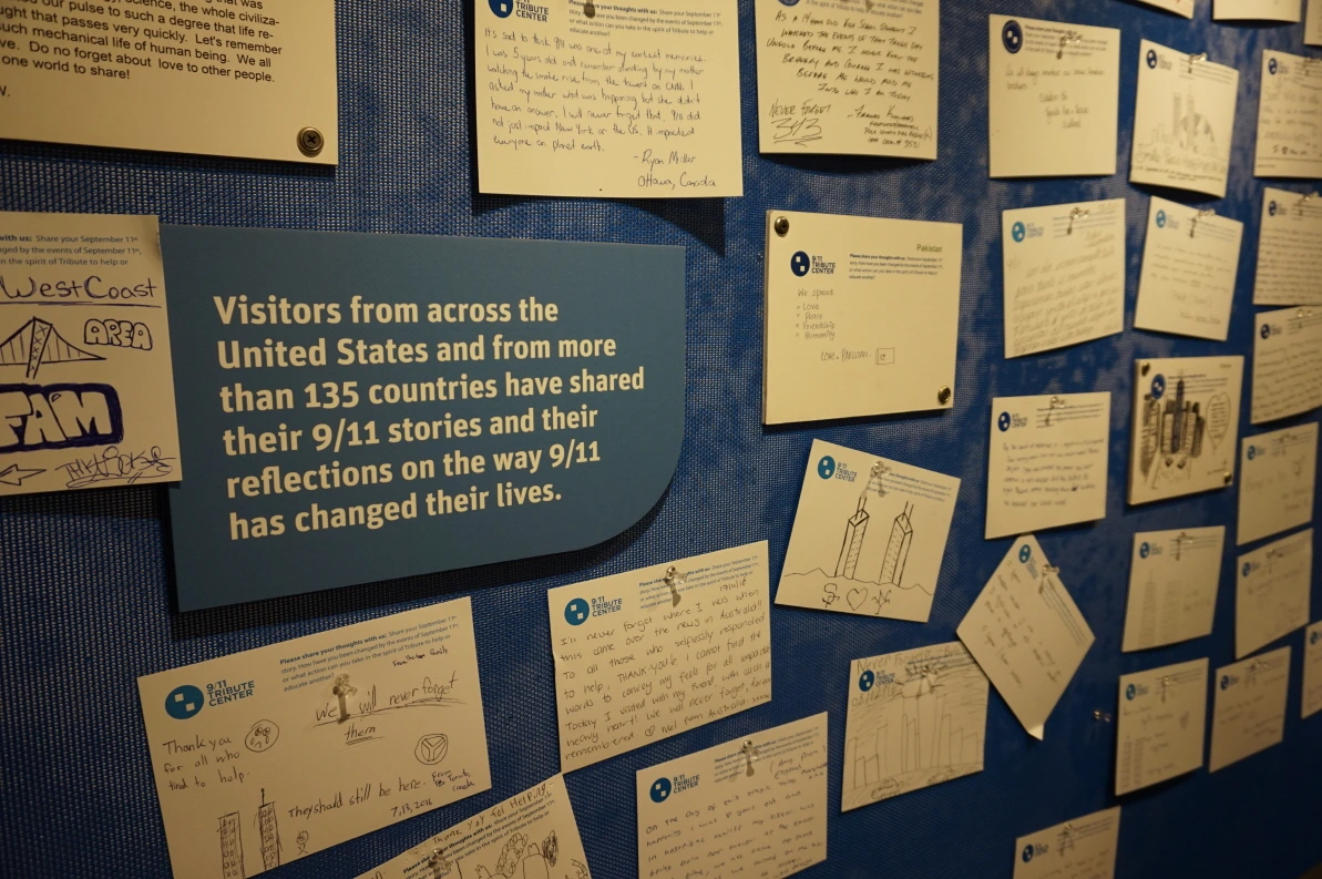 지하에 내려가니, 편지를 쓸 수 있게 마련된 공간이 있다. 나는 그들이 아닌 '그들을 기억하는' 사람들에게 하고 싶은 말을 적어 내려갔다. 왜 많은 뉴욕 시민들이 나에게 이곳을 가보라고 했는지 미처 몰랐어요. 아픈 장소, 잊고 싶은 기억일 거라고 생각했으니까. 이곳에 도착하고 나서야 알게 되었어요. 절대 잊지 않을, 계속해서 생각하고 기억해갈, 사랑하는 사람과의 이야기가 있는 곳임을. 그리고 사랑은 그 어떤 것보다 강하다고. 죽음, 복수, 테러도 사랑까지 망가뜨릴 수는 없다고. 결코.