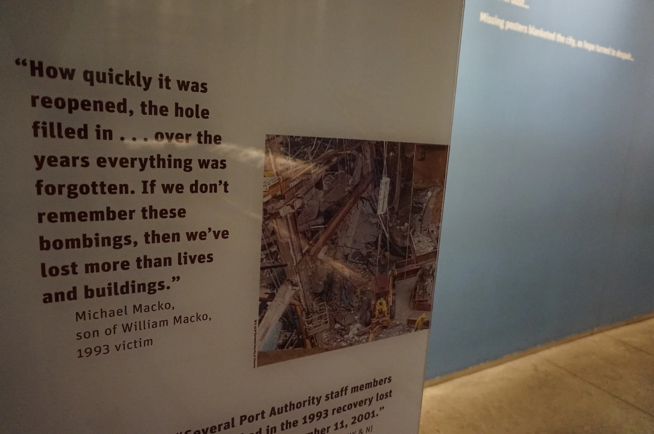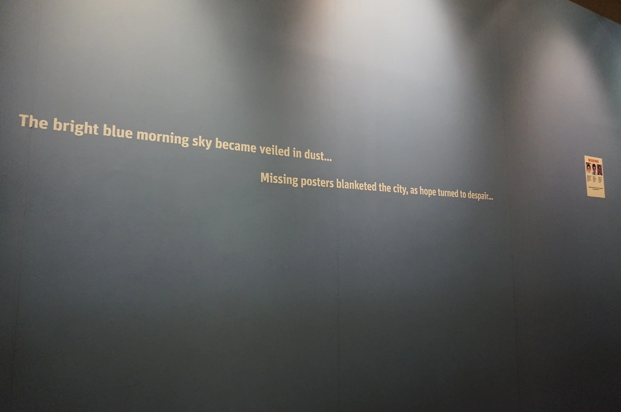 간단한 소지품 검사를 하고 입장료는 내면 911 메모리얼로 들어갈 수 있는 스티커를 나누어준다. 가슴에, 붙였다. 조심스럽게 입구로 들어가자 어두컴컴하고 조용한 내부에는 그 날 뉴스가 중계되고 있다. 건물의 파편과 구조에 쓰인 작업물. 현장에 도착한 듯 생생한 모습에 걸음이 느려졌다. 작은 탄식도 흘러나왔다.