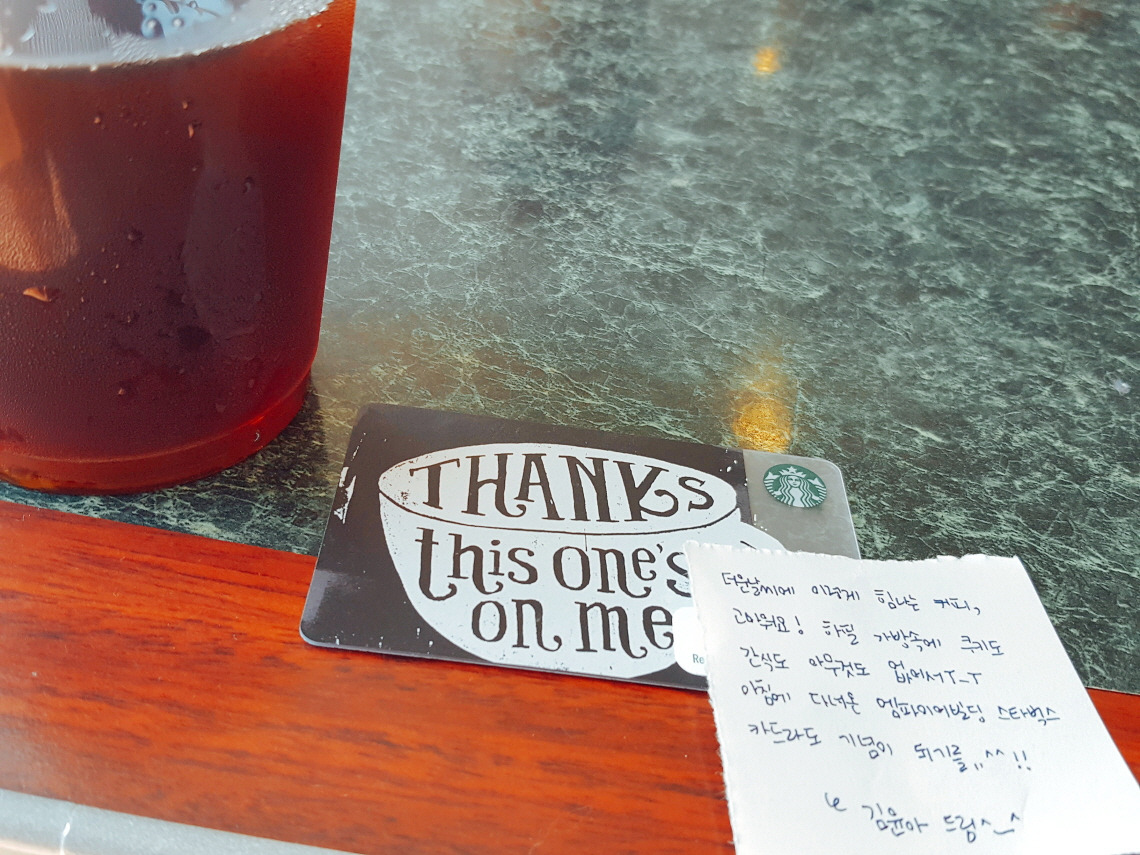 "어, 어어! 감사해요!!" "아니에요-!" 하고 돌아서 가는 그. 당황해서 고맙다는 말도 제대로 못했는데, 벌써 그는 2층으로 올라가버렸다. '아까는 엄청 무뚝뚝해 보였는데.' 쾌활하고 적극적이던 그녀와 달리 낯을 가리고 말이 없어 보인 그는 이렇게 아메리카노를 주고 갔다.