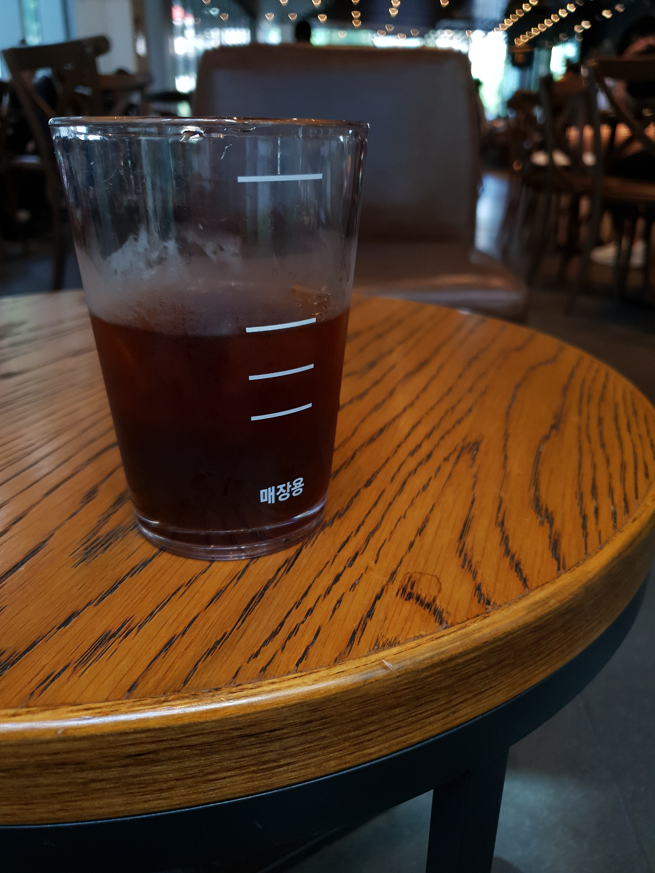 매장용이라고 쓰여 있고 4개의 눈금이 있는 플라스틱 컵입니다. 두 가지 생각이 듭니다. 아메리카노를 만드는데 아니지 에스프레소를 기본으로 하는 메뉴를 만드는데 눈금표시가 되어 있어야 일정한 퀄리티를 만들어 낼 수 있나? 그 정도로 스타벅스 바리스타는 교육이 안되어 있나? 소맥잔도 아니고.. 두 번째 이렇게 플라스틱 잔을 써야 할 정도로 스타벅스는 원가 절감을 해야 하나? 내가 바란 것은 깨끗하게 잘 닦여진 유리잔에 담겨나오는 아이스 아메리카노였는데. 그 잔이 주는 투명함 차가움.. 그리고 몇 안 되는 거품을 찍었을 때의 희열 이런 건데.