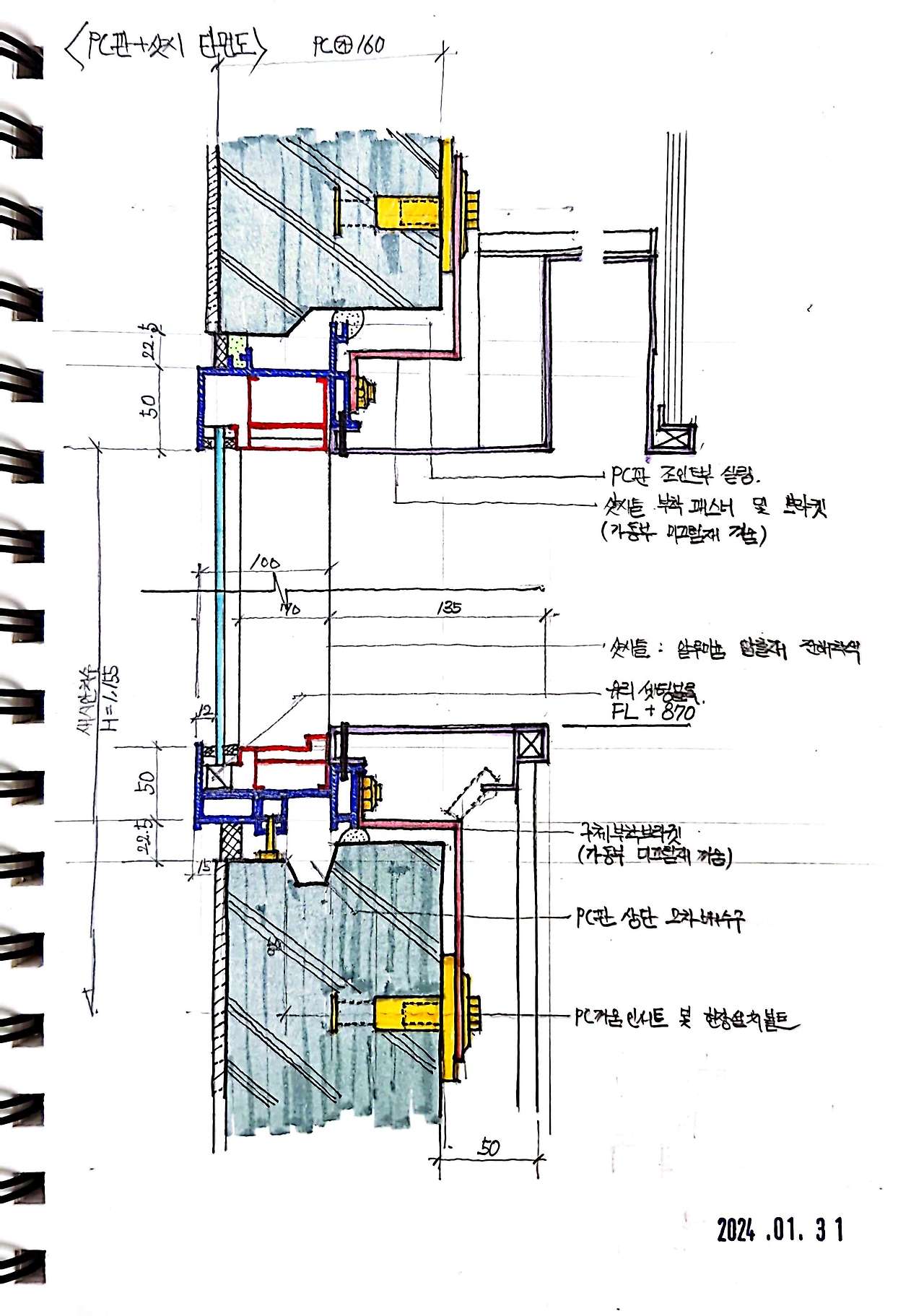 PC판에 붙은 창호의 단면상세도이다. 다른 상세도들과 마찬가지로 물처리, 단열, 부재의 신축에 대응하는 방법 등이 중요해 보인다. 책의 초반부 기초사항을 보면 시공 디테일은 결국 위 키워드들에 어떻게 대처하느냐에 관한 것으로 보인다.