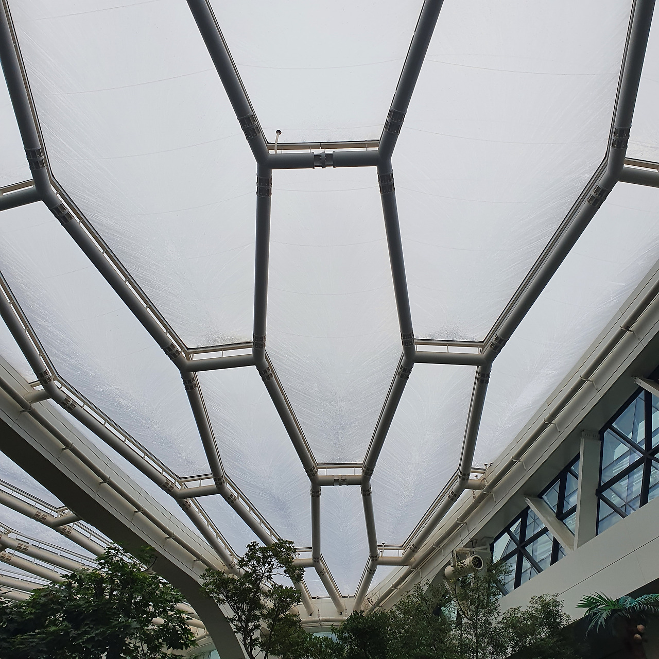 지붕의 프레임에 끼워진 것은 유리가 아니라 'ETFE필름'이다. ETFE필름은 빛 투과성, 경량성, 내구성, 친환경성 등의 장점을 갖춘 플라스틱 소재이다. 온실은 이 필름을 이중으로 사용하여 단열효과까지 보고 있다.
