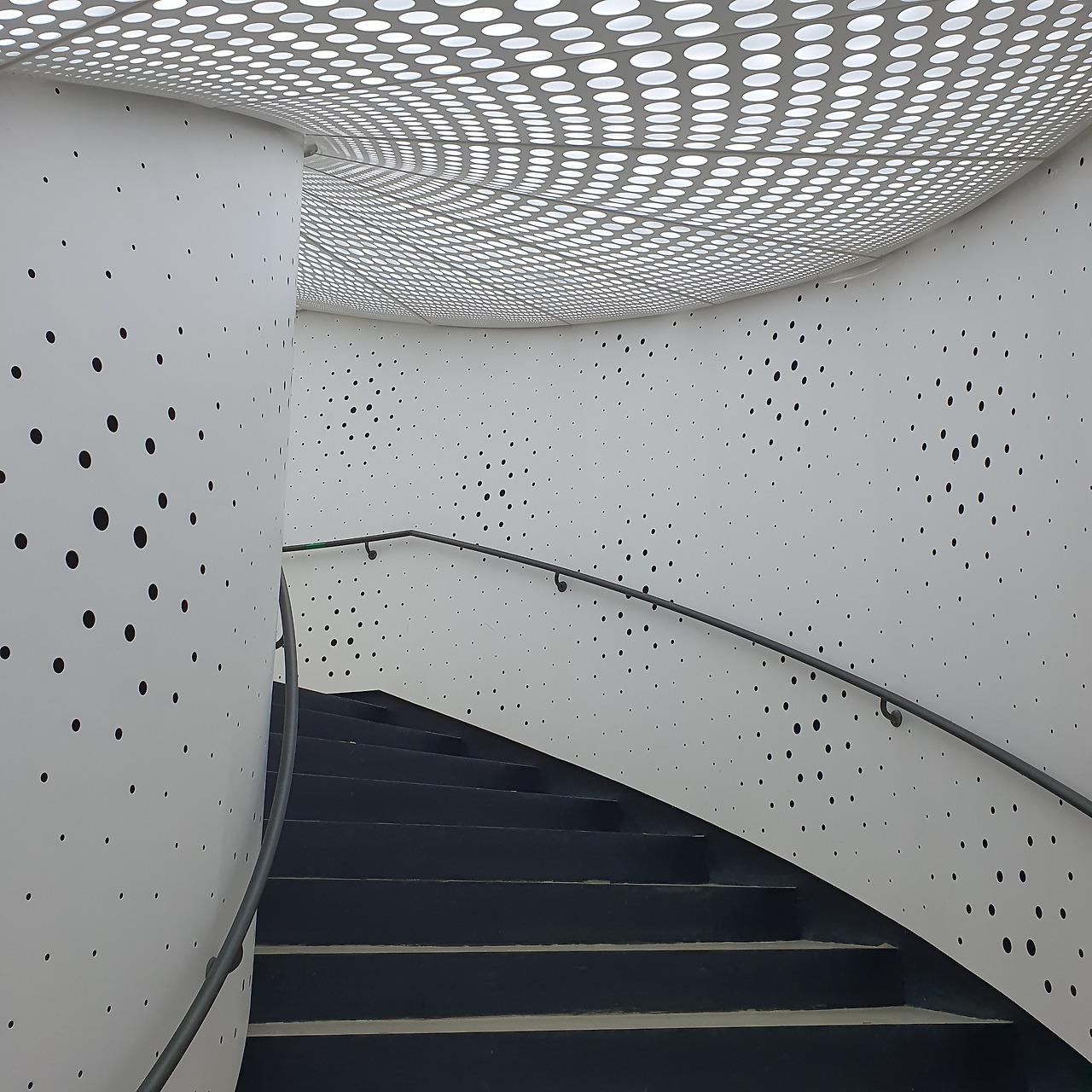 온실 코어 계단의 천장은 파라메트릭 디자인으로 만든 듯한 타공 철판으로 마감되어 있다.