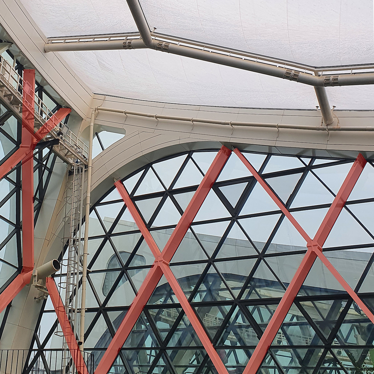 온실은 삼각형 그리드의 커튼월을 가지고 있다. 대부분의 하중은 유선형의 철골 기둥들과 건물 내부의 코어가 해결하는 것으로 보였다. 그리고 내부에서 커튼월의 프레임과 같은 선상에 트러스가 덧대어 있다. 그렇기 때문에 외부에서 바라봤을 때는 트러스가 어느 정도 감춰져서 거대한 유리면으로 읽힌다.