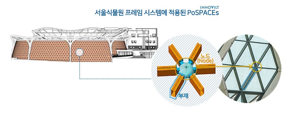 커튼월 프레임에는 포스코에서 개발한 'PoSPACEs(포스페이스)'를 적용했다. 포스페이스는 다양한 각도에 대응할 수 있도록 전용 설계 프로그램으로 정밀 제작되어 서울식물원과 같은 비정형의 커튼월에 적합하다고 한다. 또한 속이 빈 구형의 노드에 부재들을 용접(모멘트 접합)하여 제작하기 때문에 경량하고 힌지접합에 비해 안정적이다.