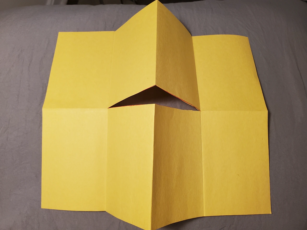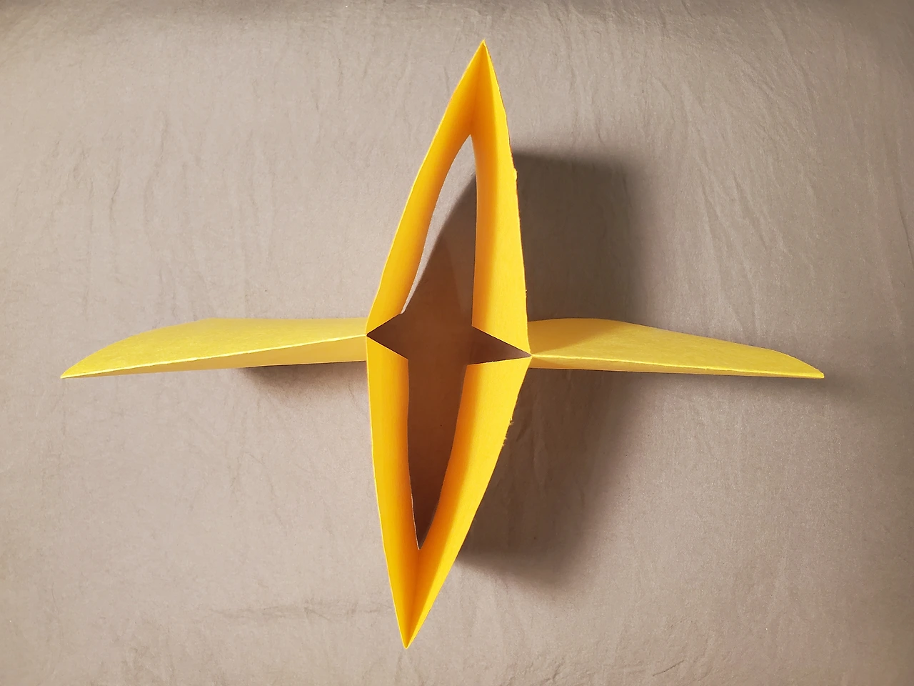 3) 잘라진 부분을 벌려 주어 위에서 보았을 때 십자가 모양이 되도록 종이를 겹친다.