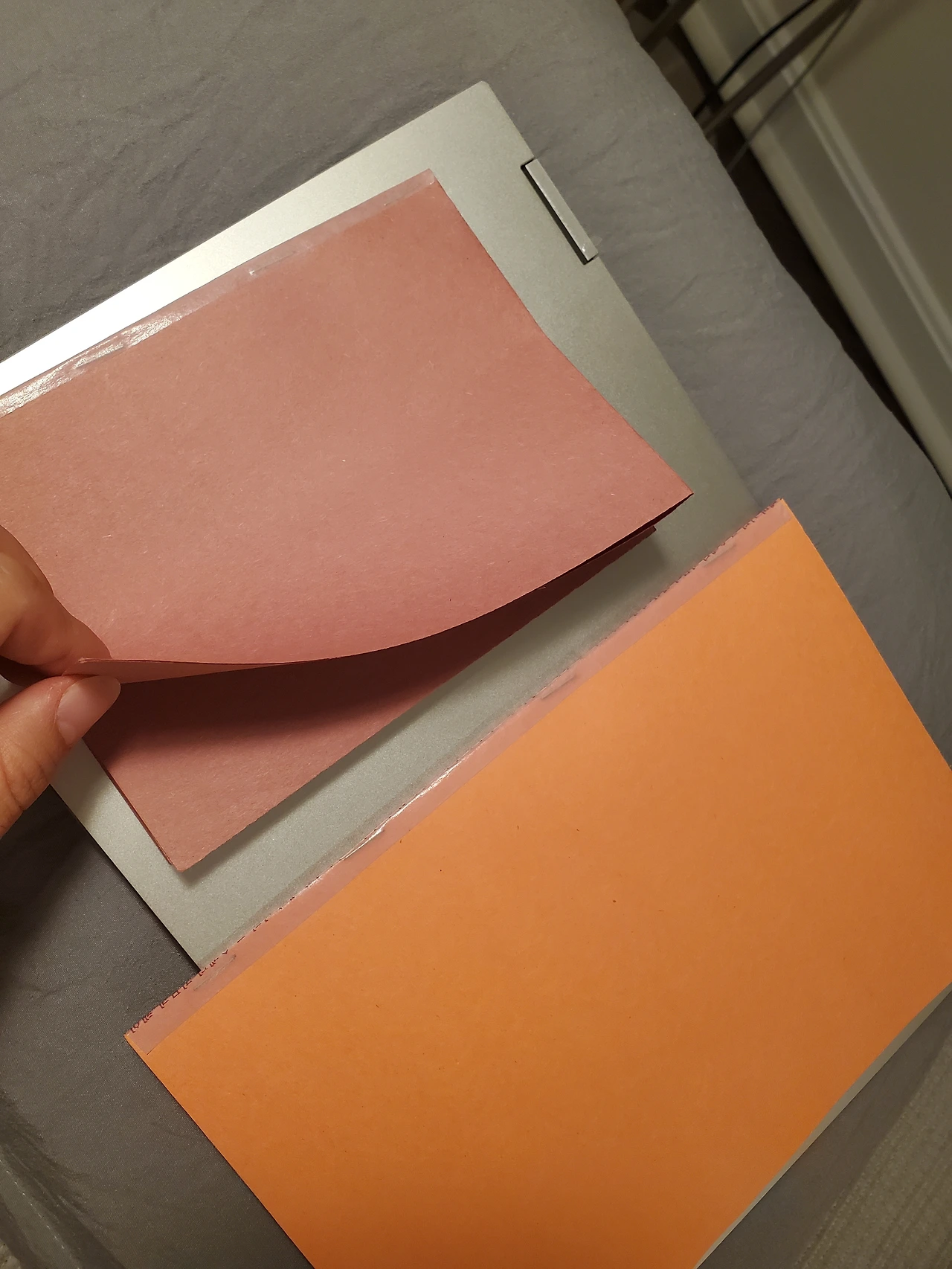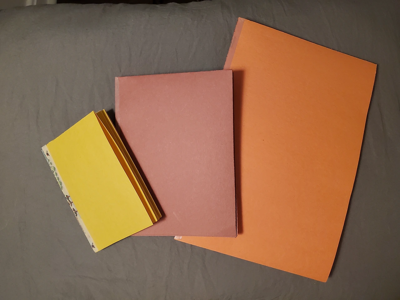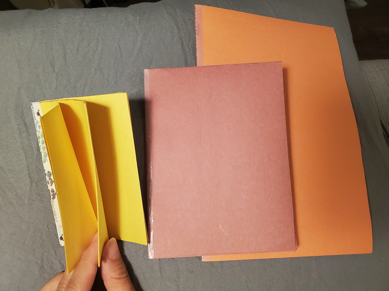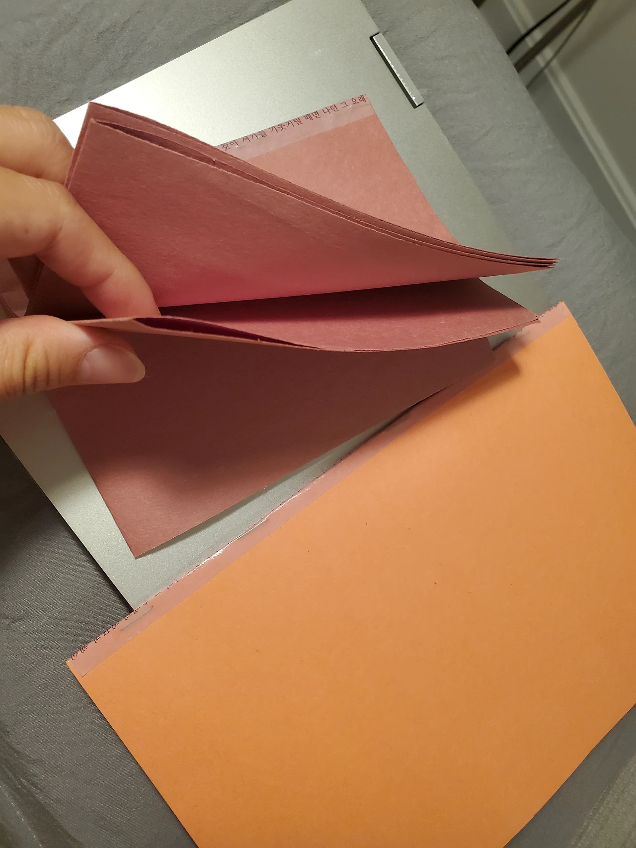 A4용지(letter 사이즈 용지) 사이즈의 색지를 8등분으로 접어 가운데 선을 가위로 자르고 겹치는 부분을 풀로 붙여주면 귀여운 소책자가 완성된다. 상세한 순서와 사진을 덧붙여 본다.
