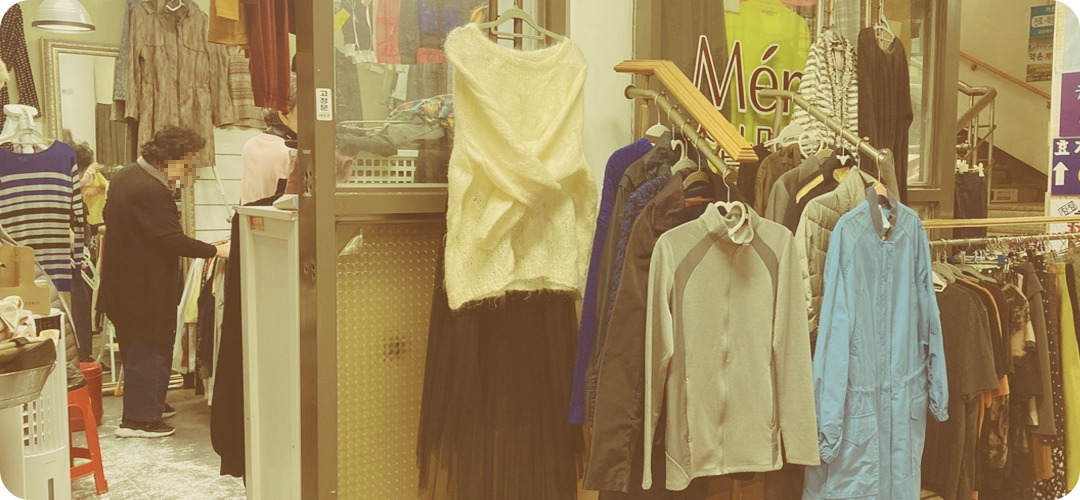 바로 옆 매장은 할머니께서 운영하시는 구제 옷 가게입니다. 만원이 넘지 않는 옷들이 대부분이고 천 원 이천 원하는 셔츠들이 가득해요. 항상 첫 손님이 망설이지 않고 비밀번호를 누르고 들어가세요. 4평 남짓한 작은 가게라 행거 하나를 밖으로 내놓는 것으로 오픈 준비는 끝. 그렇게 마련된 공간에 의자를 꺼내 자리를 잡으시고는 스스로 커피도 타서 드시고, 처음 오는 손님에게는 능숙하게 장사도 하세요. 맞습니다. 이곳은 동네에서 패션 좀 안다는 알뜰한 멋쟁이 할머니들의 사랑방입니다.