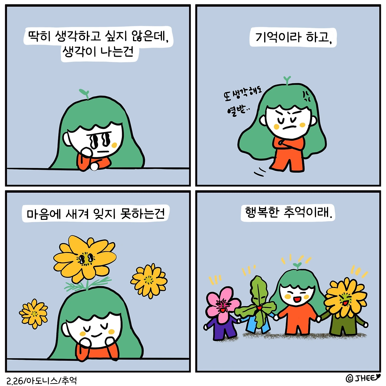 마음에 새겨 자꾸 떠오르는 마음을 추억이라 한다.