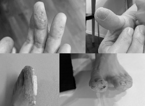 기포는 온 손가락에 번지다 못해 발가락까지 퍼졌다. 진피가 한 겹 두 겹 벗겨지더니 폭발 직전의 용암지대처럼 엄지발가락이 갈라졌다. 외출할 때 양말을 신으면 피와 진물이 안쪽에 말라붙어, 벗을 때마다 뜯겨나갔다. 피부와 양말이 한 덩어리가 되어.