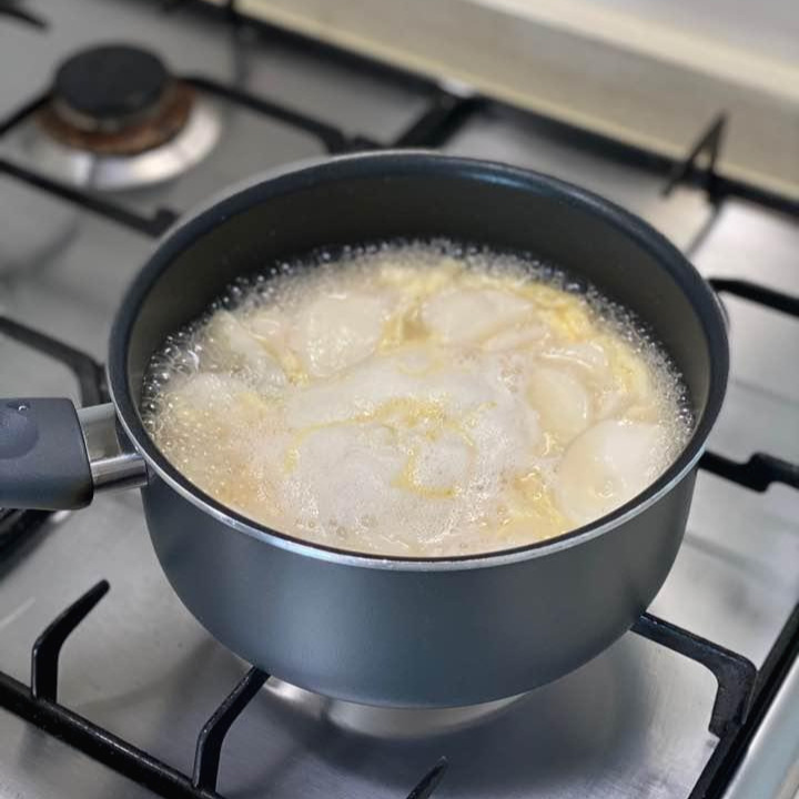 달걀의 흰자와 노른자를 분리해서 지단을 만들어 색깔별로 올려놓으면 좋겠지만, 그것도 내년 설날 아침에나 하기로 한다. 해장이 급하니 그냥 달걀 푼 물을 끓는 떡만둣국 위로 두른다. 그러고는 후추와 파를 듬뿍 넣는다.