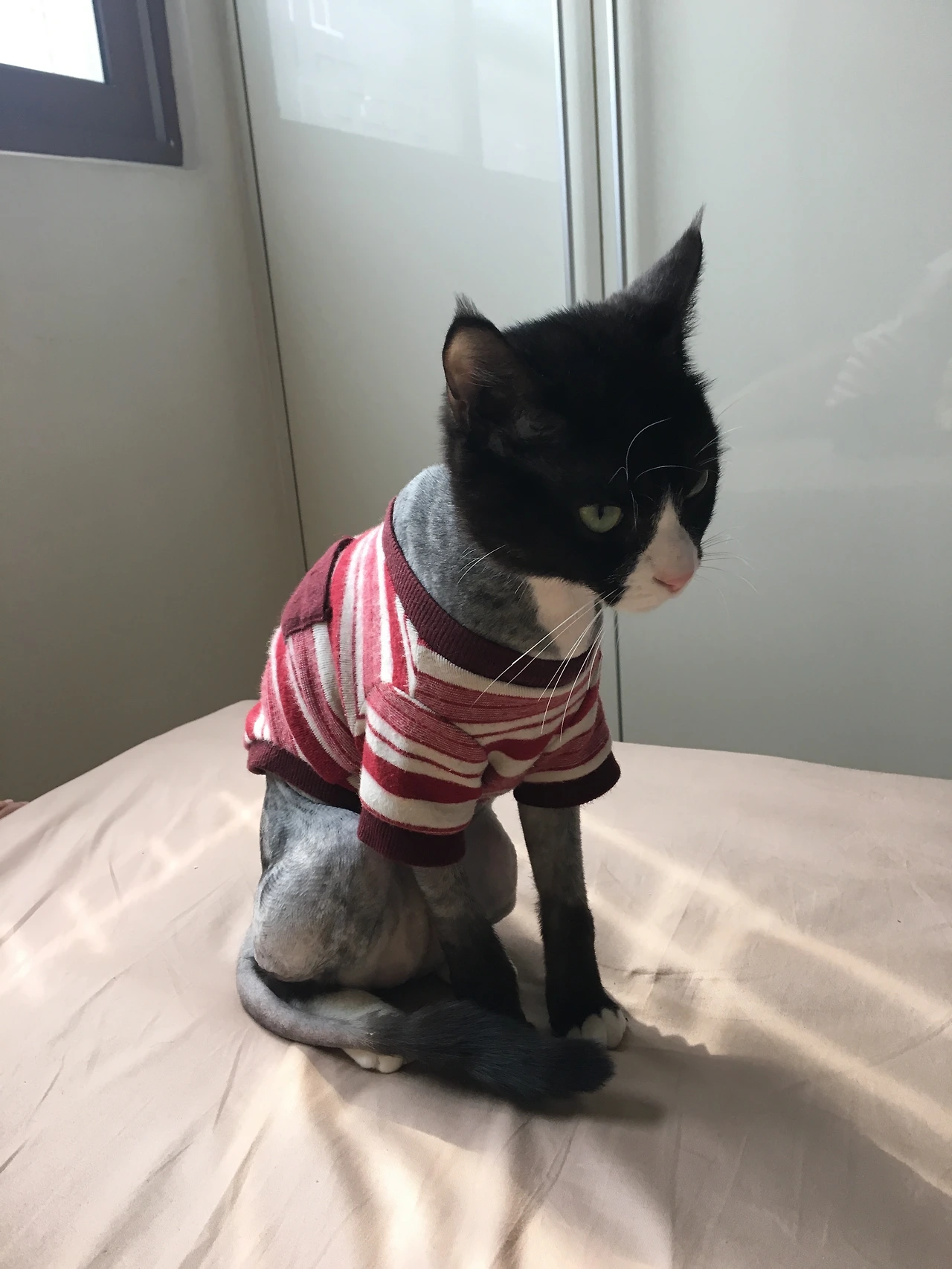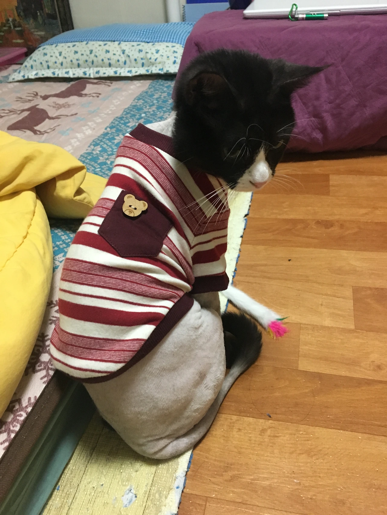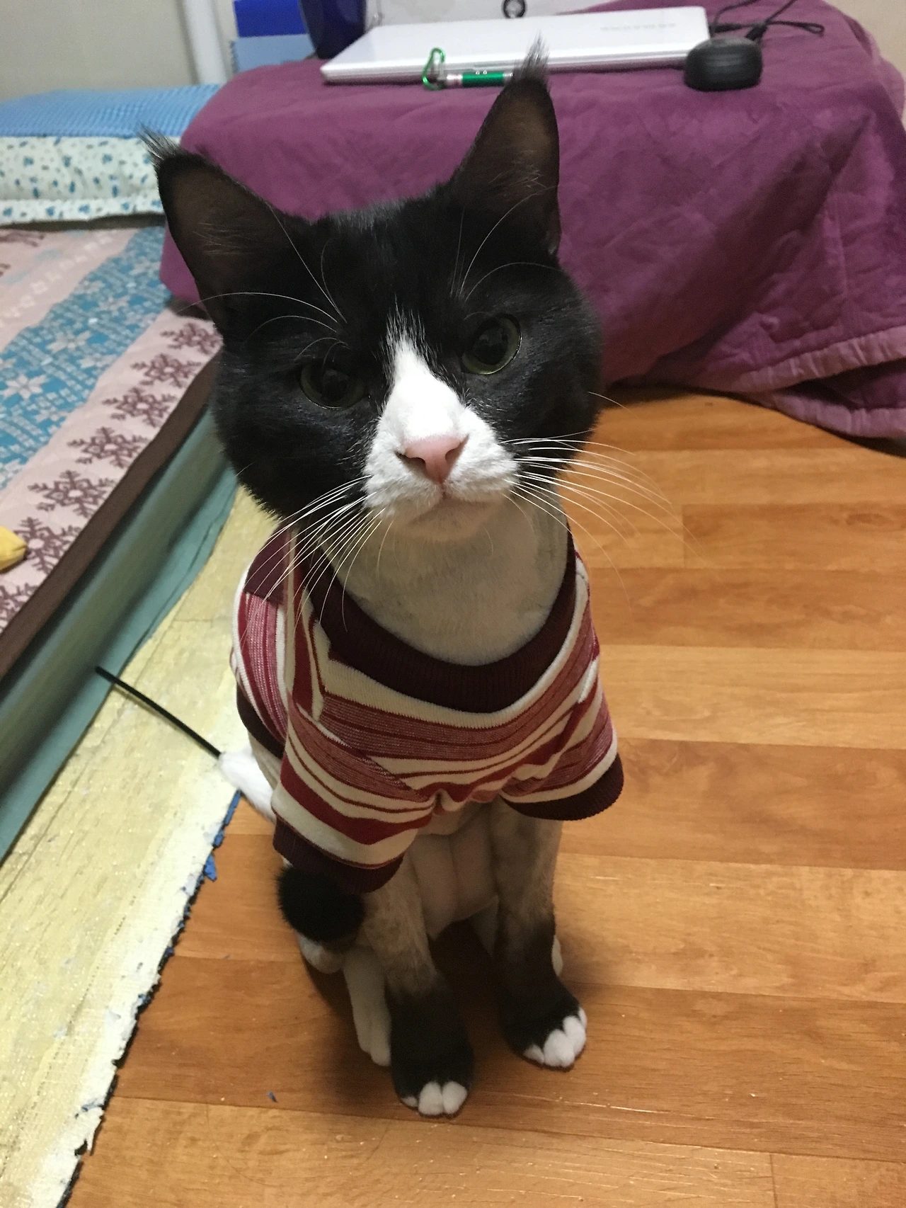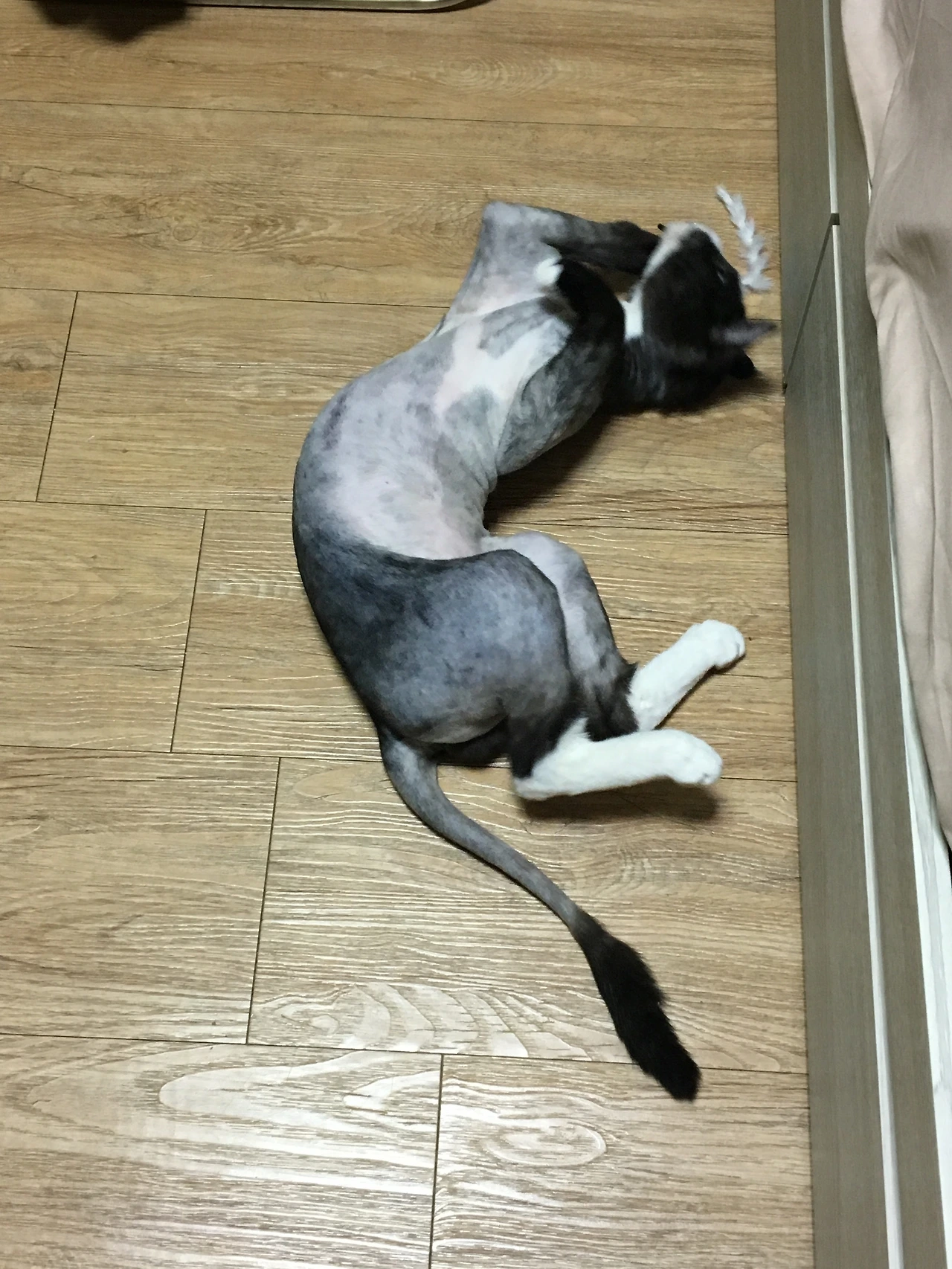 털을 밀고 난 후 대근이가 추울까 봐 빨간 옷을 사 입혔다. 옷을 입는 것도 불편해할 법 한데 대근이는 한 번도 싫은 티를 낸 적 없었다. 정말, 정말로 우리 대근이는 신사 같았다.