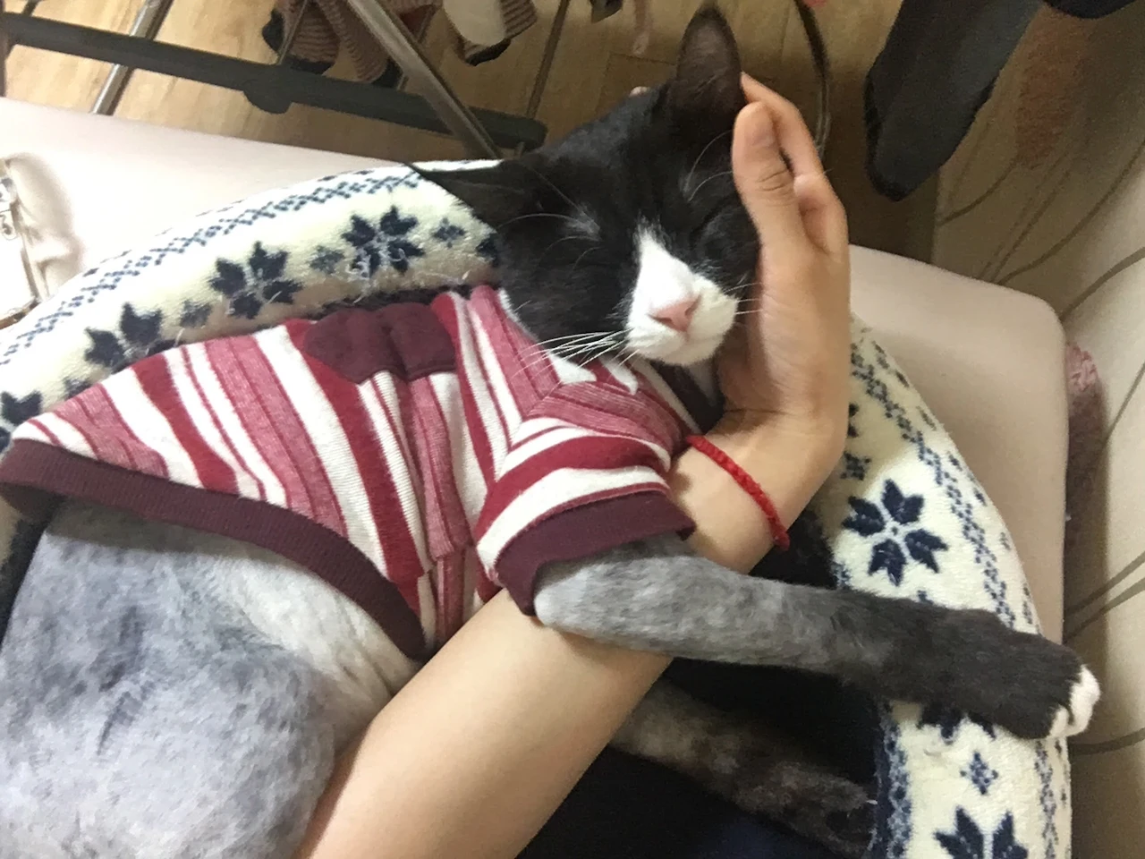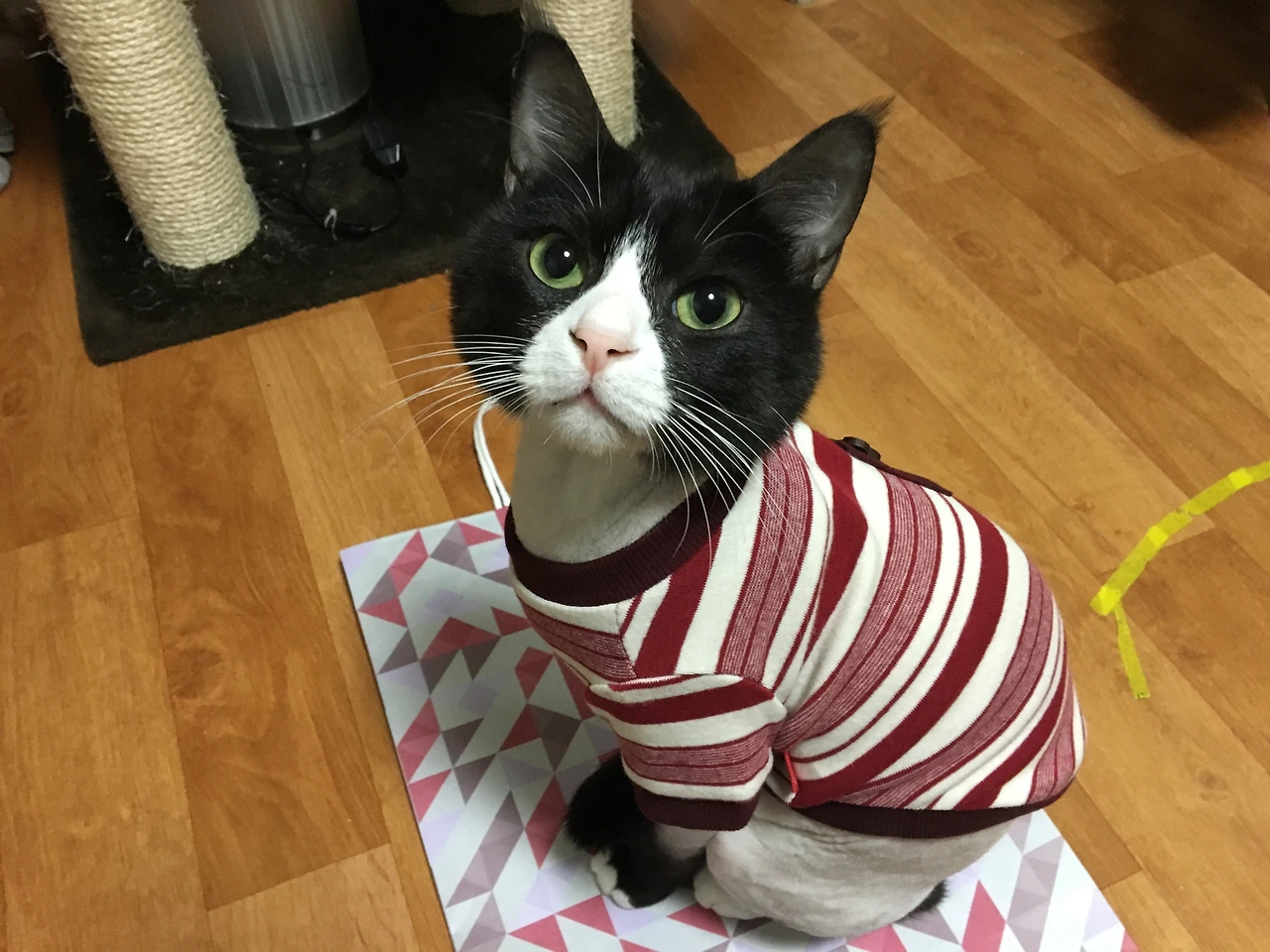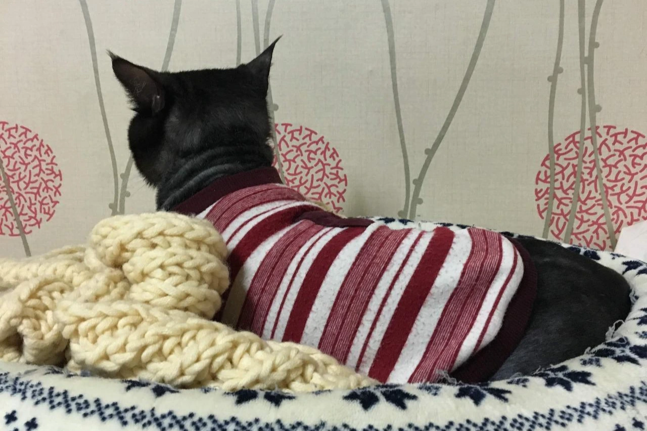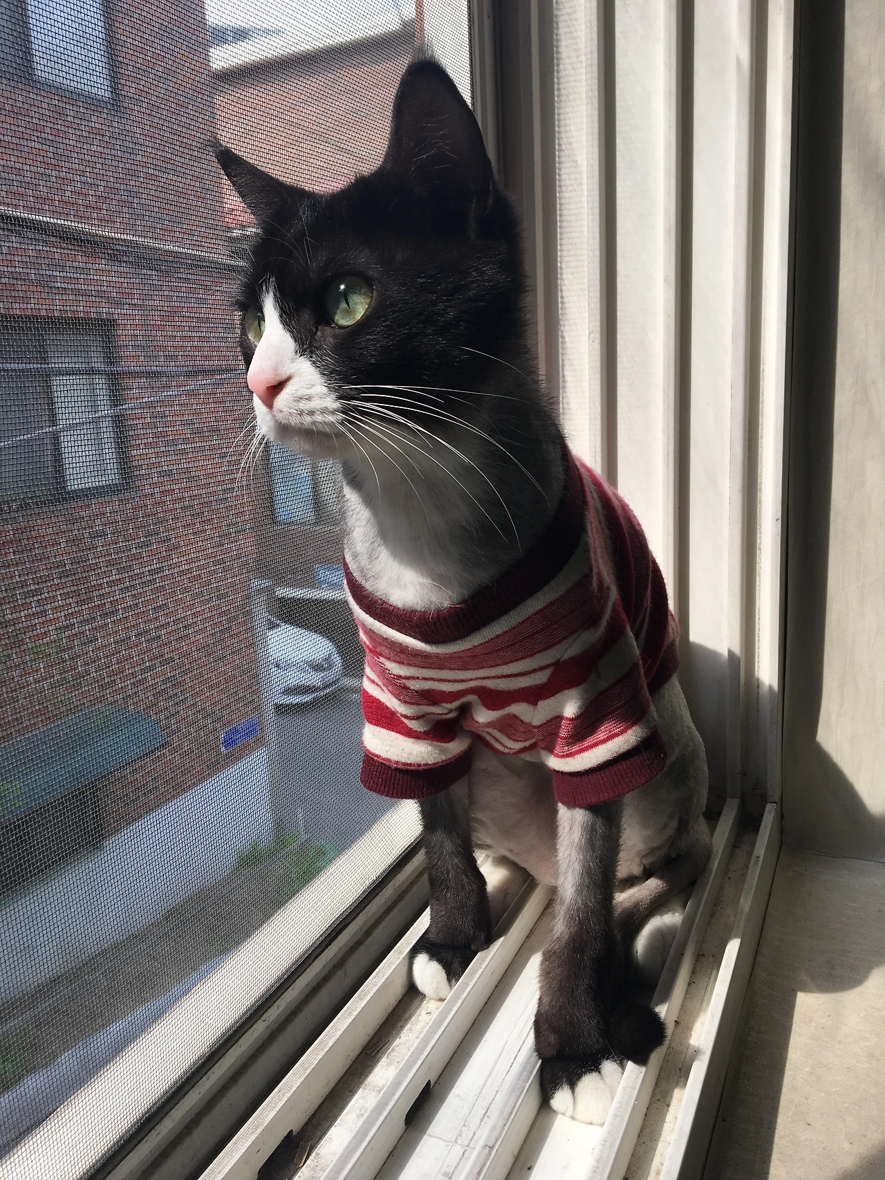 털을 밀고 난 후 대근이가 추울까 봐 빨간 옷을 사 입혔다. 옷을 입는 것도 불편해할 법 한데 대근이는 한 번도 싫은 티를 낸 적 없었다. 정말, 정말로 우리 대근이는 신사 같았다.