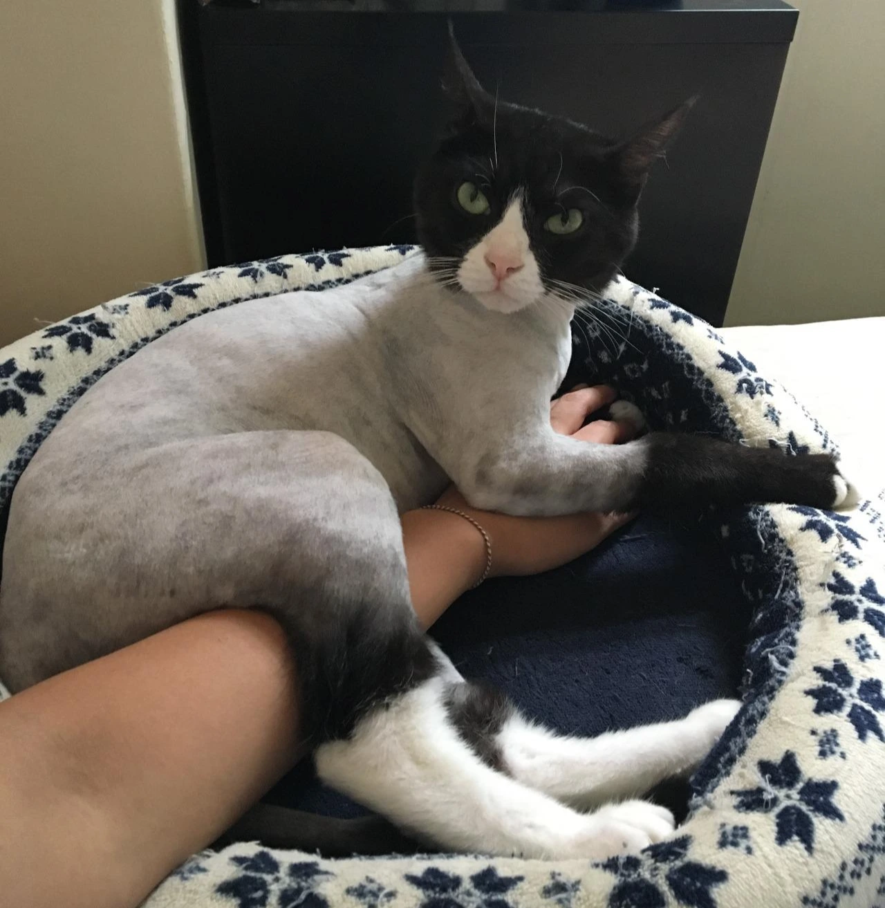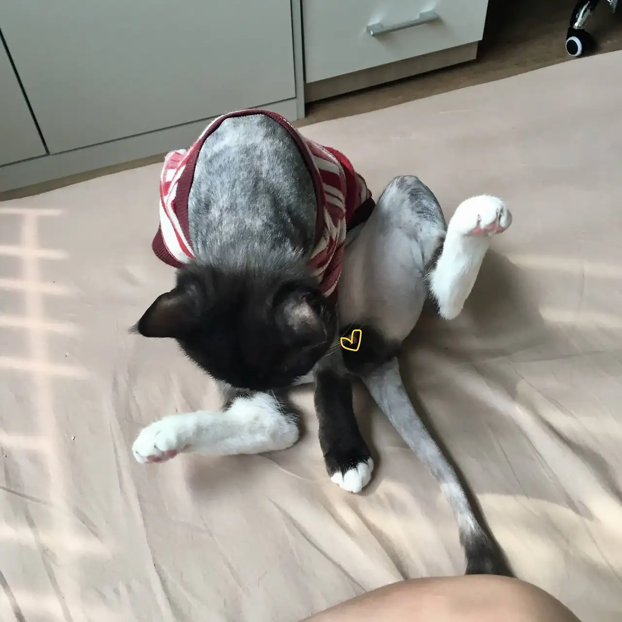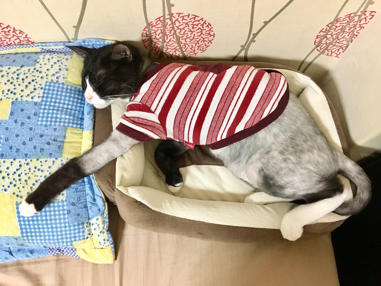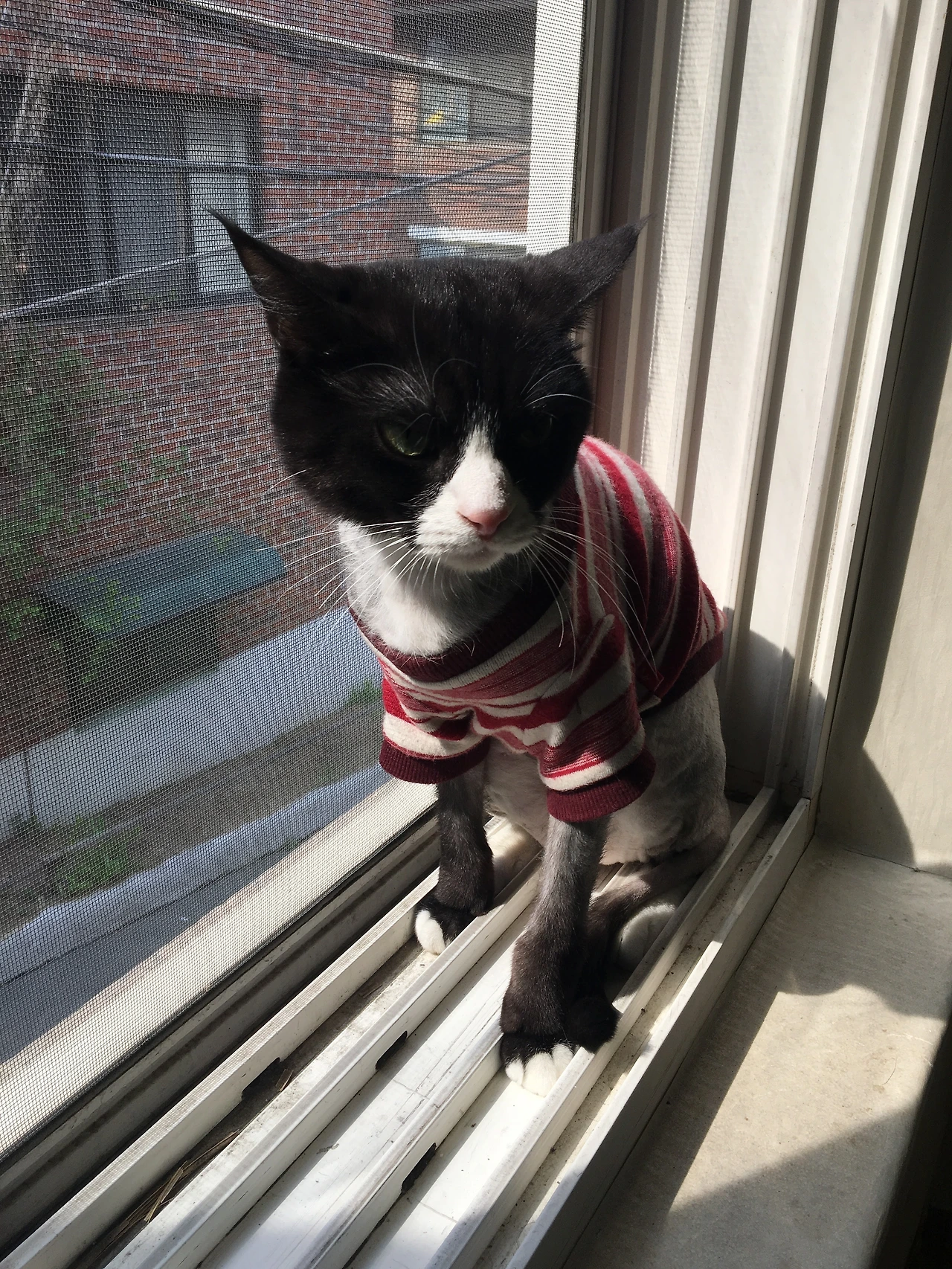 털을 밀고 난 후 대근이가 추울까 봐 빨간 옷을 사 입혔다. 옷을 입는 것도 불편해할 법 한데 대근이는 한 번도 싫은 티를 낸 적 없었다. 정말, 정말로 우리 대근이는 신사 같았다.