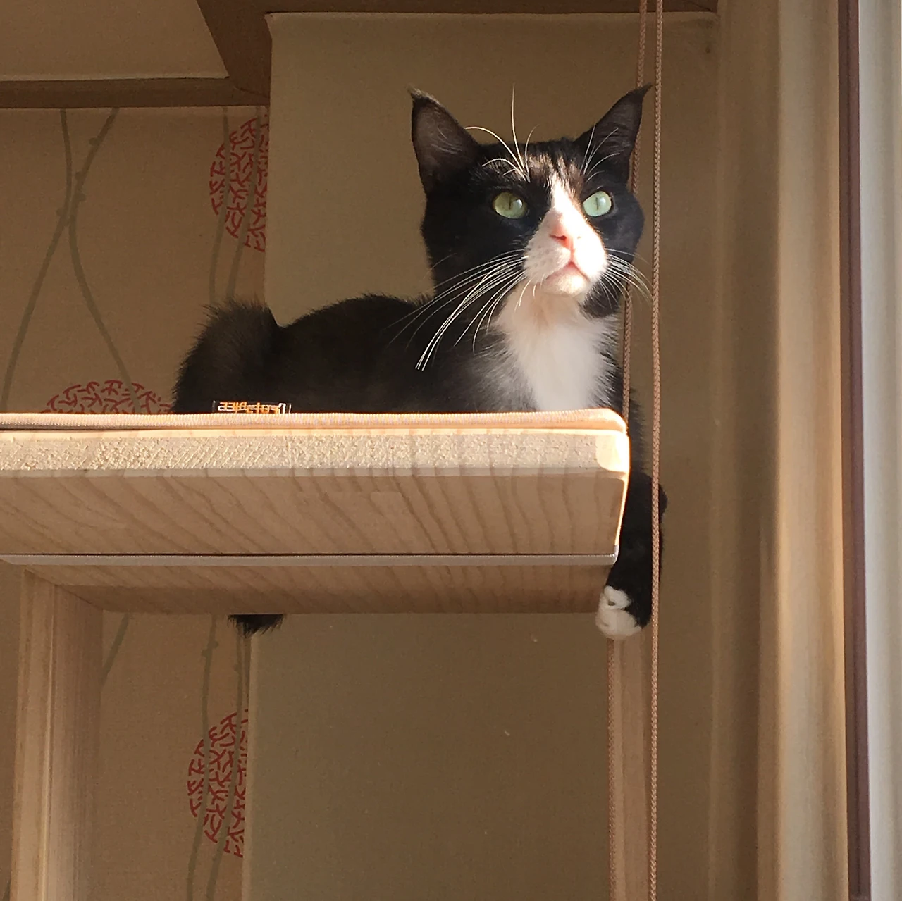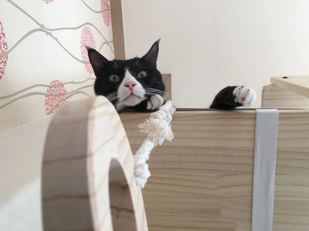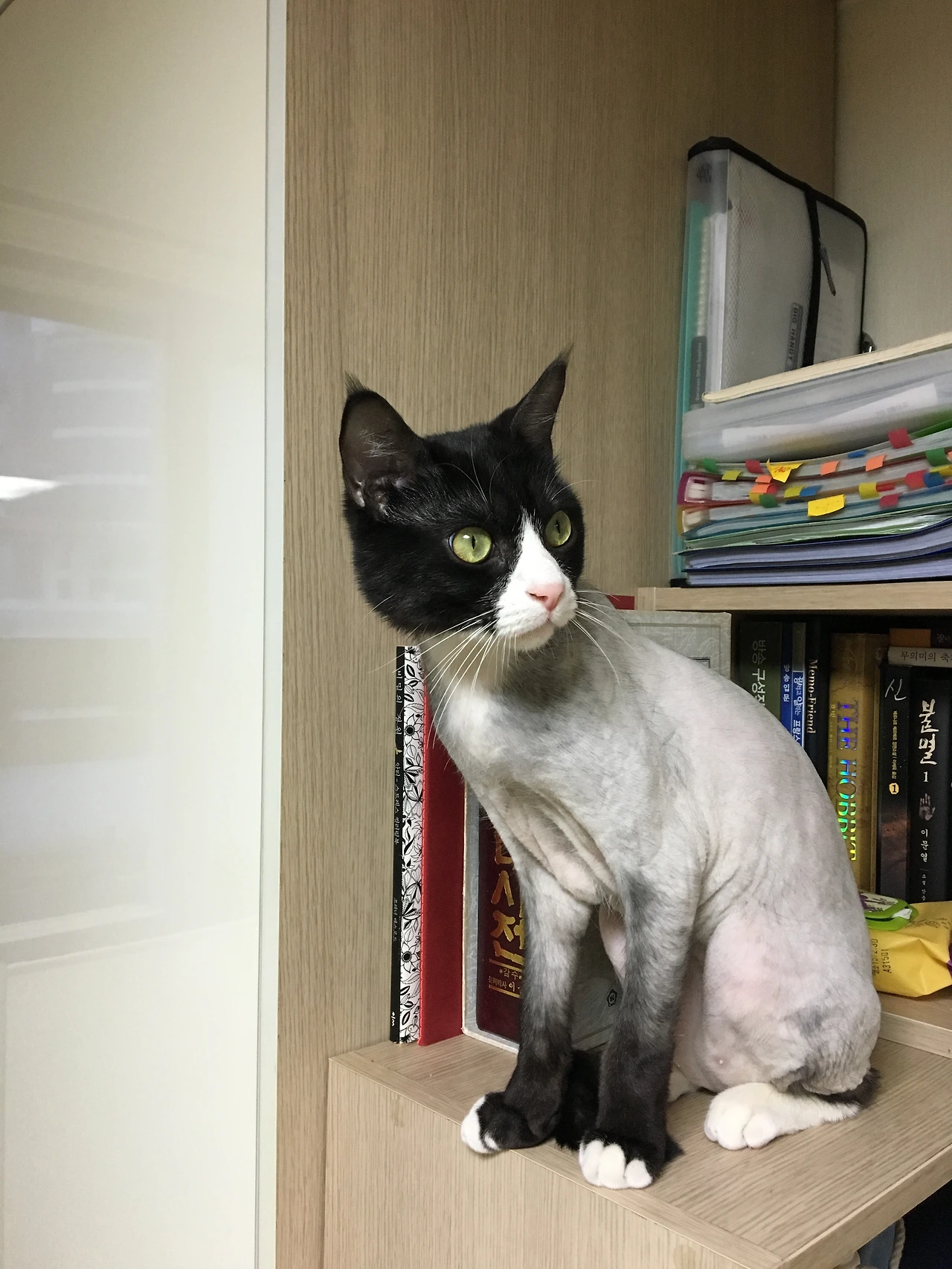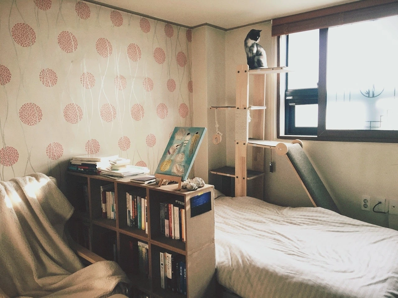 집이 점점 자리를 잡아갔다. 어수선하던 집 내부는 대근이의 물품으로 하나 둘 차기 시작했고 캣타워도 먼지가 덜 날리는 원목으로 바꿨다. 물건을 어지르지 않는 대근이 덕분에 내가 좋아하는 것들을 진열할 수 있었던 게 가장 좋았다. 물론 나중에는 어지럽게 놓여있던 것들을 싹 치우고 죄다 수직 공간으로 만들긴 했다. 다만 저 때는 저 집에 적응을 하던 기간이라, 이것저것 로망을 실현하느라 바빴을 뿐. 그래도 수직 공간 위의 대근이는 미친 듯이 귀여워서 사진을 안 찍고는 버틸 수 없을 정도였다!