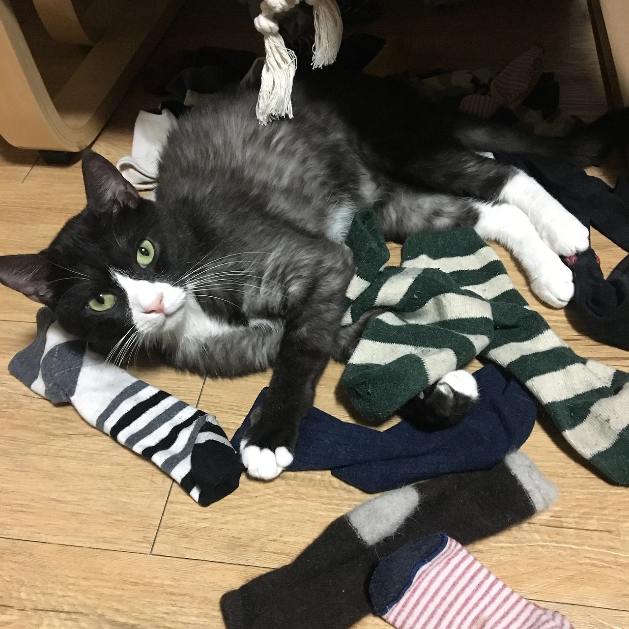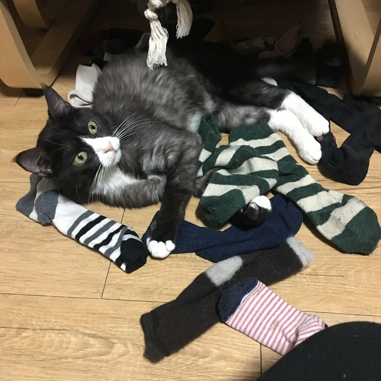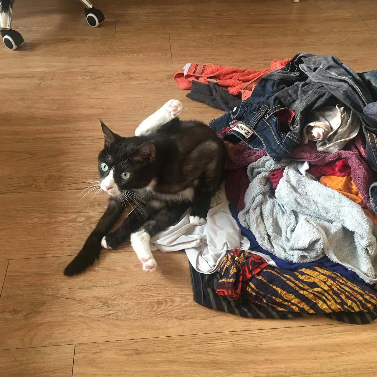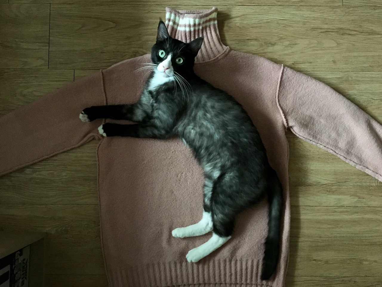 물론 우리가 함께 산다는 사실은 나 뿐만 아니라 모두가 알았다. 옷에도 털, 가방에도 털 가끔 지갑에도 털! 혹시라도 알레르기가 있는 사람에게 피해를 주지 않기위해 모든 털을 열심히 떼고 살았지만, 대근이 털은 돌돌이를 피하듯 여기저기서 나타났다. 왜냐, 대근이는 빨래 위에 눕는 걸 좋아했기 때문! 특히 건조대게 널기 위해 바닥에 내려놓은 상태의 빨래를 가장 좋아했다. 축축하고 차가운데 왜 그러는 지 알 순 없었지만, 그래도 대근이가 좋아하면... 그 모습이 귀여워서 미친듯이 사진을 찍었다.