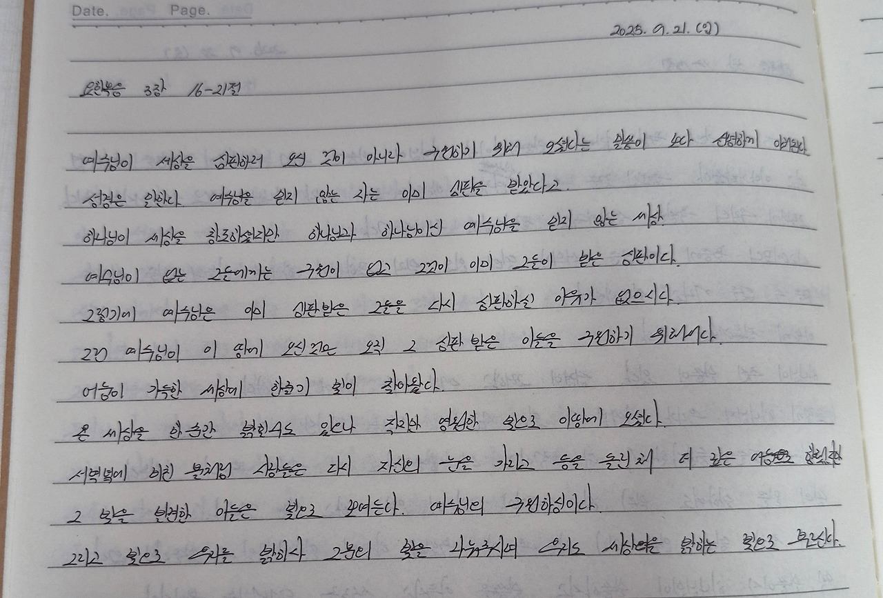 예수님이 세상을 심판하러 오신 것이 아니라 구원하기 위해 이 땅에 오셨다는 말씀이 보다 선명하게 이해된다. 성경은 말한다. 예수님을 믿지 않는 자들은 이미 심판을 받았다고. 하나님이 세상을 창조하셨지만 하나님과 하나님이신 예수님을 믿지 않는 세상. 예수님이 없는 그들에게는 구원이 없고 그것이 이미 그들이 받은 심판이다. 그렇기에 예수님은 이미 심판받은 그들을 다시 심판하실 이유가 없다. 그런 예수님이 이 땅에 오신 것은 오직 그들을 구원하시기 위해서다.