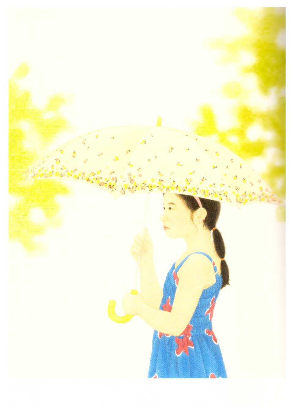 동시대 미술작가 백지혜3)는 아이들의 풋풋하고 순수함을 잘 포착한 사람이다. 그녀의 그림에는 여아나 소녀가 자주 등장하며, 평화로운 일상의 모습을 잔잔하게 비춰준다. <스쳐가는 여름>에서 양산을 두 손에 받쳐 든 아이의 옆모습이 인상적이다. 민소매가 유난히 여름날의 활기를 말해 주는 것 같다. 노란 양산과 음영으로만 보이는 연두빛 나무는 맑은 하늘을 간직한 여름날의 고운 기억을 불러낸다.