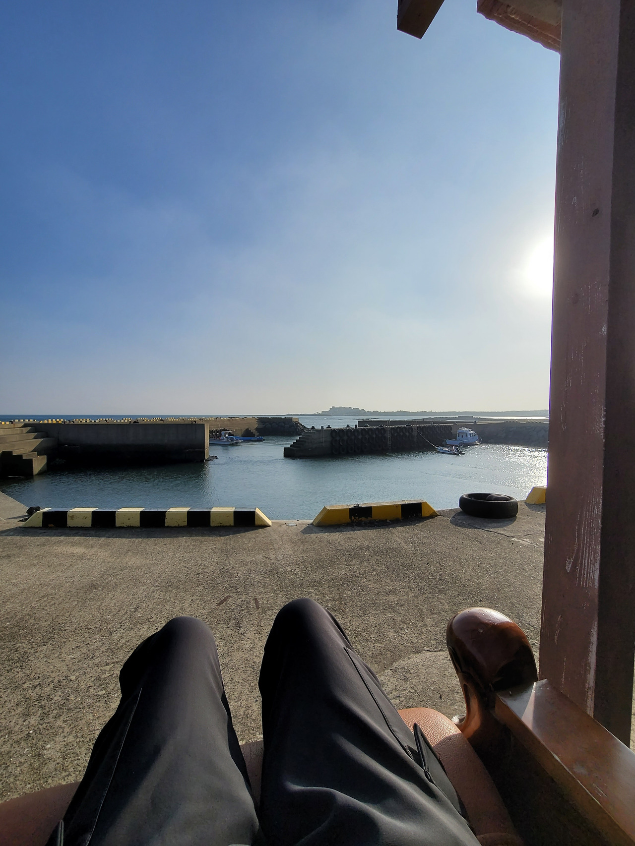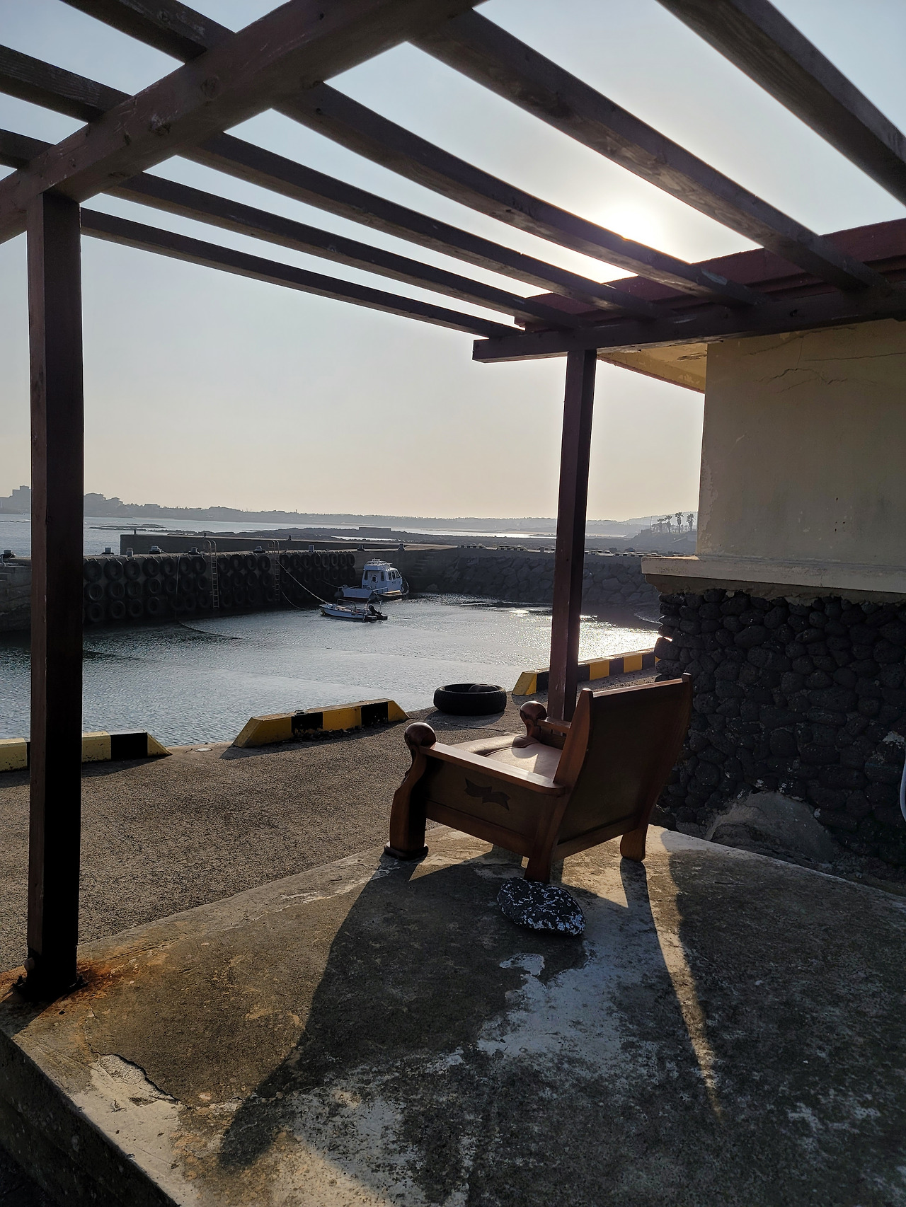 어쨌든 그곳에서 나는 인생 최고의 의자를 만났다. 폭신폭신하고 아늑한 의자와 눈앞의 바다, 귤빛 햇살에 부서지는 먼지들, 파도에 넘실대는 선체들, 하늘에 넘실대는 구름들, 따뜻한 공기. 그리고 아주 어여쁜 고양이와 눈 마주친 10초간의 조우.