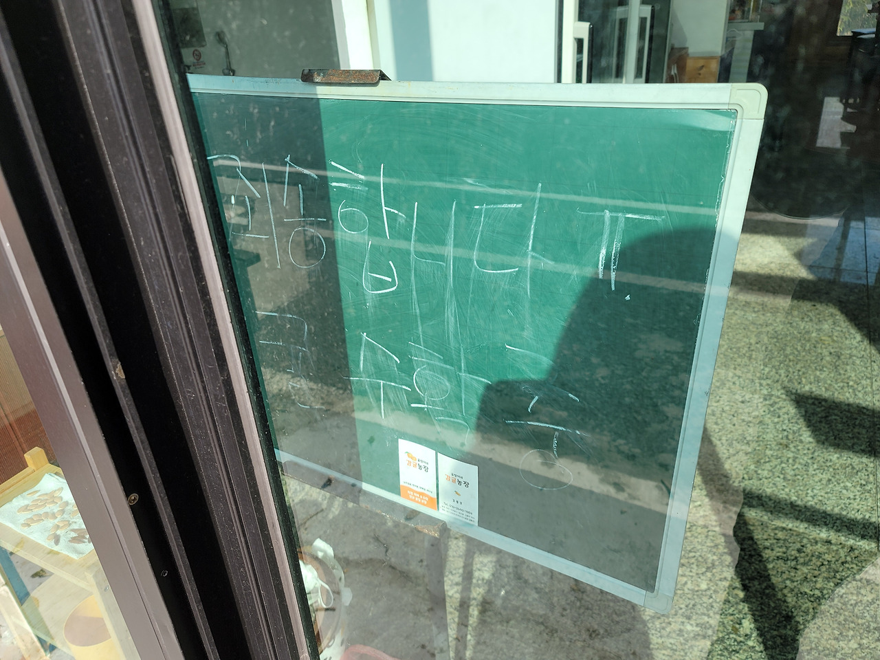 마침 어제 숙소에 여행계획을 짜다 올레 3-B 코스 중간에 있는 '주어코지 국수창고'라는 식당을 발견해서 그곳에서 점심을 먹기로 마음먹고 있었다. 해산물 비빔국수와 보말김밥이 유명한 곳이다. 그런데 가는 날이 장날이라더니 유리문에 '귤수확으로 영업을 잠시 쉽니다'라는 종이와 함께 귀여운 고양이만이 가게 안에 누워 늘어지게 낮잠을 자고 있었다.