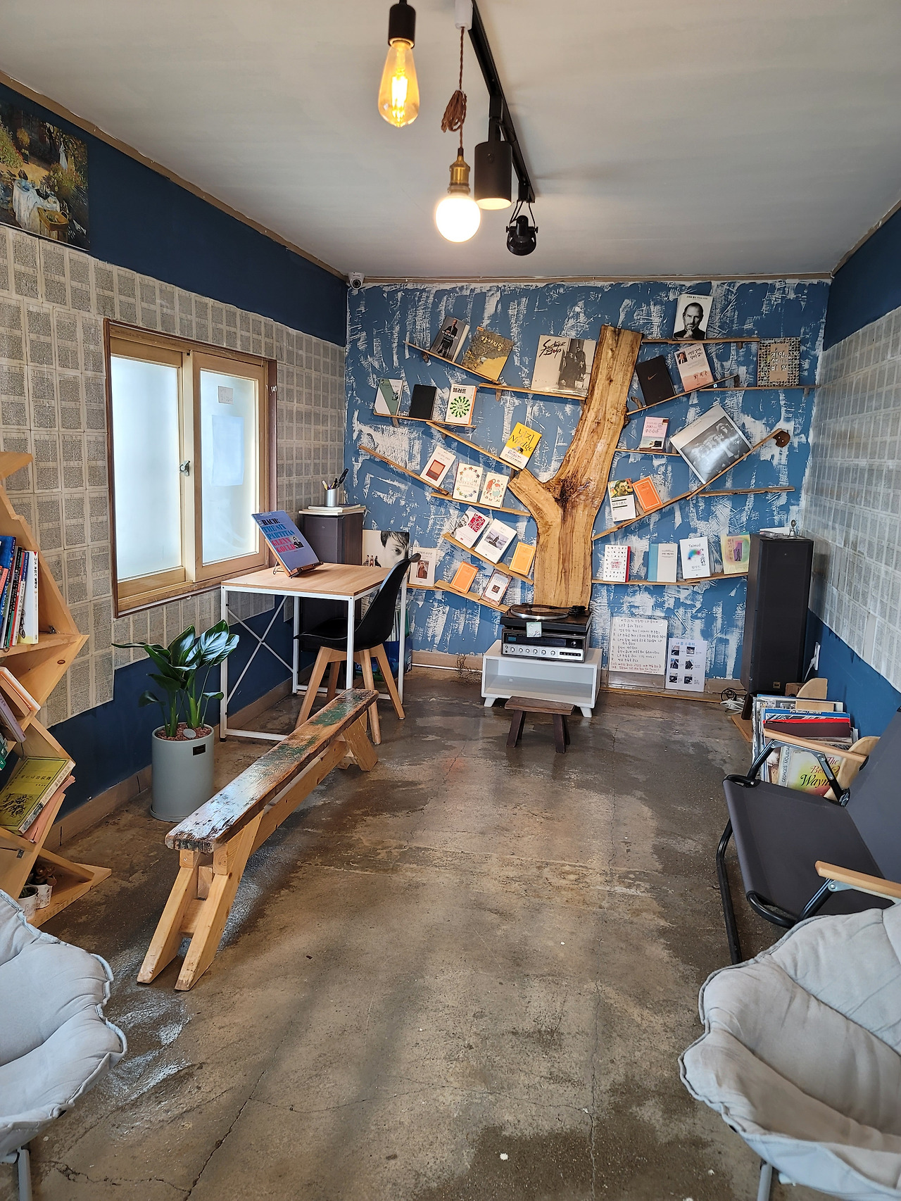 창밖이 보이는 테이블에 앉았다. 바깥에 보이는 풍경이 비현실적이다. 푸른 바다가 철썩 거리며 파도치고, 햇살은 눈부시게 내리죄며, 바람에 나뭇잎들이 나부낀다. 움직이는 액자를 보고 있는 것 같다. LP플레이어가 고장 나있어 대신 핸드폰으로 음악을 틀었다. 음악을 들으며 창가 자리에 앉아 바다를 보고 있자니 지금 이곳이 현실이 아닌 저 우주 속 한 서점인듯하다. 아무도 없는 무인 우주 정거장의 무인 서점. 그곳에 불시착한 나.
