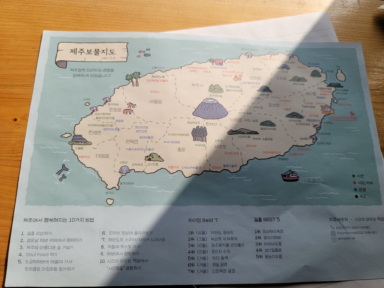달콤했던 의자의 시간을 뒤로하고 소금막 해변으로 향했다. '시간이 머무는 책방'에서 얻은 보물지도에 의하면 '해 뜰 때 이곳에서 하는 또라클럽 아침운동'이 유명하다고 하는데 어떤 것인지 참으로 궁금하다. 이 보물지도에는 제주에서 행복해지는 10가지 방법이 소개되어 있는데 다음과 같다.