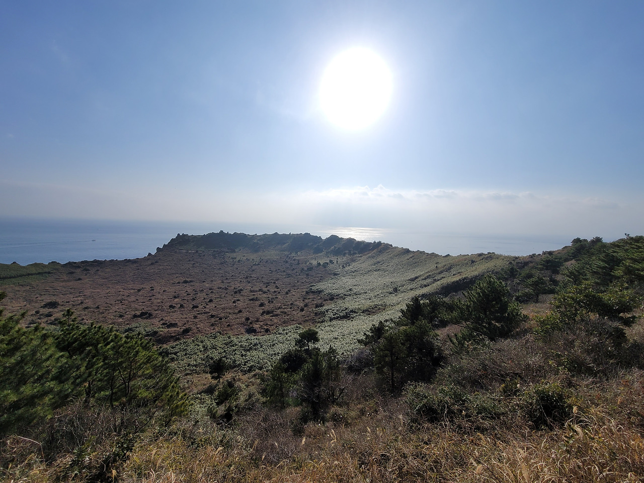 성산일출봉 매표소에 가서 정상으로 오르는 입장료 5천 원을 내고 길을 시작했다. 예전에 왔을 때는 올라가는 길이 정비되지 않은 편이어서 꽤 스펙터클했었는데 지금은 모든 길이 계단으로 깔끔하게 정비되어 있었다. 뭔가 예전이 더 스릴 넘치고 좋았던 것 같다. 그러나 성산일출봉의 정상은 여전했다. 신비롭고 눈부시며 아름답다. 앞쪽으로는 화산활동으로 생긴 신비한 구덩이가 있고 뒤쪽으로는 우도와 성산항, 성산읍 마을과 밭의 곡선들, 배와 사람들이 조그맣게 보인다. 처음 성산일출봉을 올랐을 때는 일출시간이었기에 그 신비로움이 배가 되었다. 온갖 색이 다 있는듯한 하늘과 구름, 그리고 성산봉의 곡선이 만들어내는 조화가 마치 탄생신화 속 한 장면을 보는 듯했다. 세월은 흘러 나는 나이를 먹었지만 성산은 아직도 같은 자리에 누워 바람을 맞고 파도를 안으며 서 있다. 그 한결같음이 나에게 묘한 포근함과 안심, 고향에 돌아온 것 같은 애틋함을 주었다. 그래서 성산은 언제 와도 좋다.