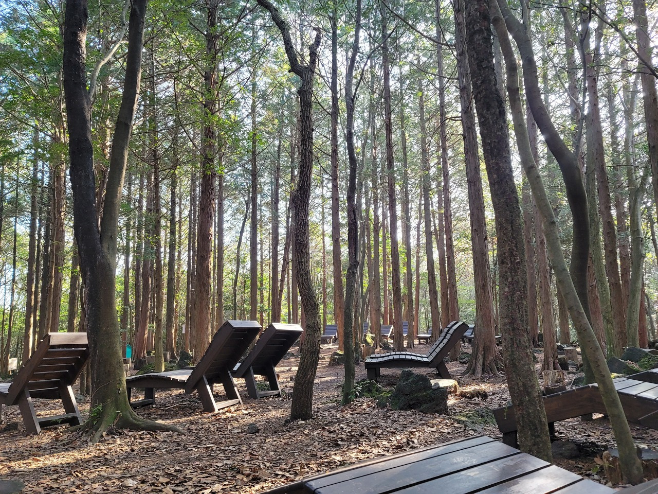 이곳은 가장 맑고 신선한 공기가 존재한다고 하는 해발 320m~760m에 위치하고 있어서 공기가 달고 깨끗하다. 외식으로 몸이 안좋았던 나의 컨디션이 단숨에 회복될 정도였다. 중간에 쉼팡(쉬는 곳)에 있는 나무 의자에 누워 한없이 나무멍, 하늘멍을 하고 싶을 정도로 공기가 너무 달다. 새소리와 나의 숨소리, 그리고 나무가 호흡하는 소리만 존재하는 시간. 머리를 어지럽히는 잡념과 생각들을 놓아보내고 순수한 살아있음을 만끽할 수 있는 곳이었다.