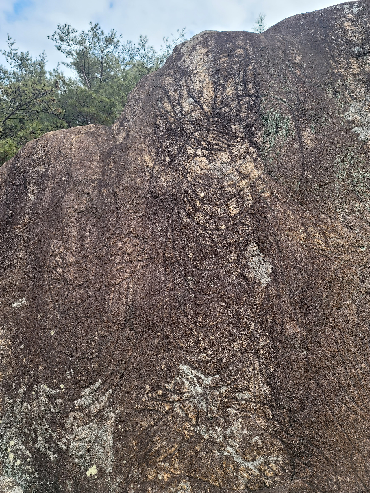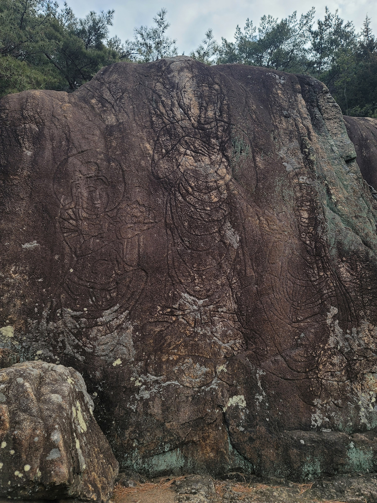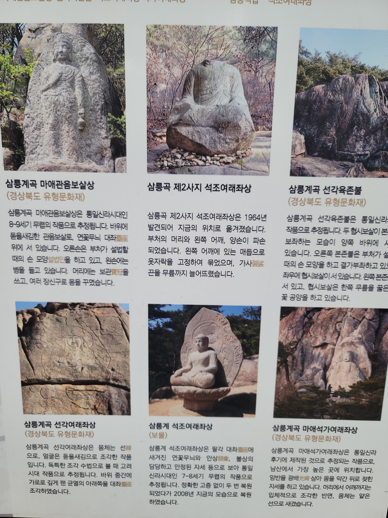 그렇게 아주 천천히 남산을 올랐다. 한발 한발 아기가 걸음마를 처음 배우고 발을 조심히 내딛듯이 그렇게. 머리와 어깨, 양손이 파손되어 몸만 남은 삼릉곡 제2사지 석조여래좌상을 만나고, 두 번째 문화재 삼릉계곡 선각육존불을 만났다. 아주 커다랗고 평평한 바위에 부처와 보살을 선으로 새긴 작품이다. 자연암벽에 음각의 선으로만 새긴 것이어서 조각이라기보다는 그림에 가까운 선각육존불. 오랜 세월 바람과 비를 맞아 그 형태와 색깔이 예전과 같지 않을 그 암벽을 가만히 앉아 바라보았다. 그리고 지금도 조금씩 암벽에 음각된 선을 조금씩 옅게 하고 있는 바람이 나의 얼굴에 닿는 것을 느껴본다. 돌에 새겨진 부처는 긴 시간을 버티며 지금도 이렇게 남아 시간을 초월해 사람들을 만나고 있다. 그러나 언젠가 이 육존불도 조금씩 조금씩 사라져 나중에는 비와 바람과 하나 되어 시간 속으로 사라질 것이다. 시간이 지나면 이 육존불을 새겼던 석공이 죽고, 이 앞에서 부처를 향해 기도를 올리던 사람들도 죽고, 나처럼 남산을 오르며 이곳을 지났을 사람들도 죽고, 모두가 죽는 것처럼 이 선각육존불도 사라질 것이다. 어쩌면 석공은 그 사실을 알고 있었을 것이다. 그는 부처를 새기며 동시에 '모든 것은 공으로 돌아간다'는 무상의 진리를 바위에 새긴 것이다.