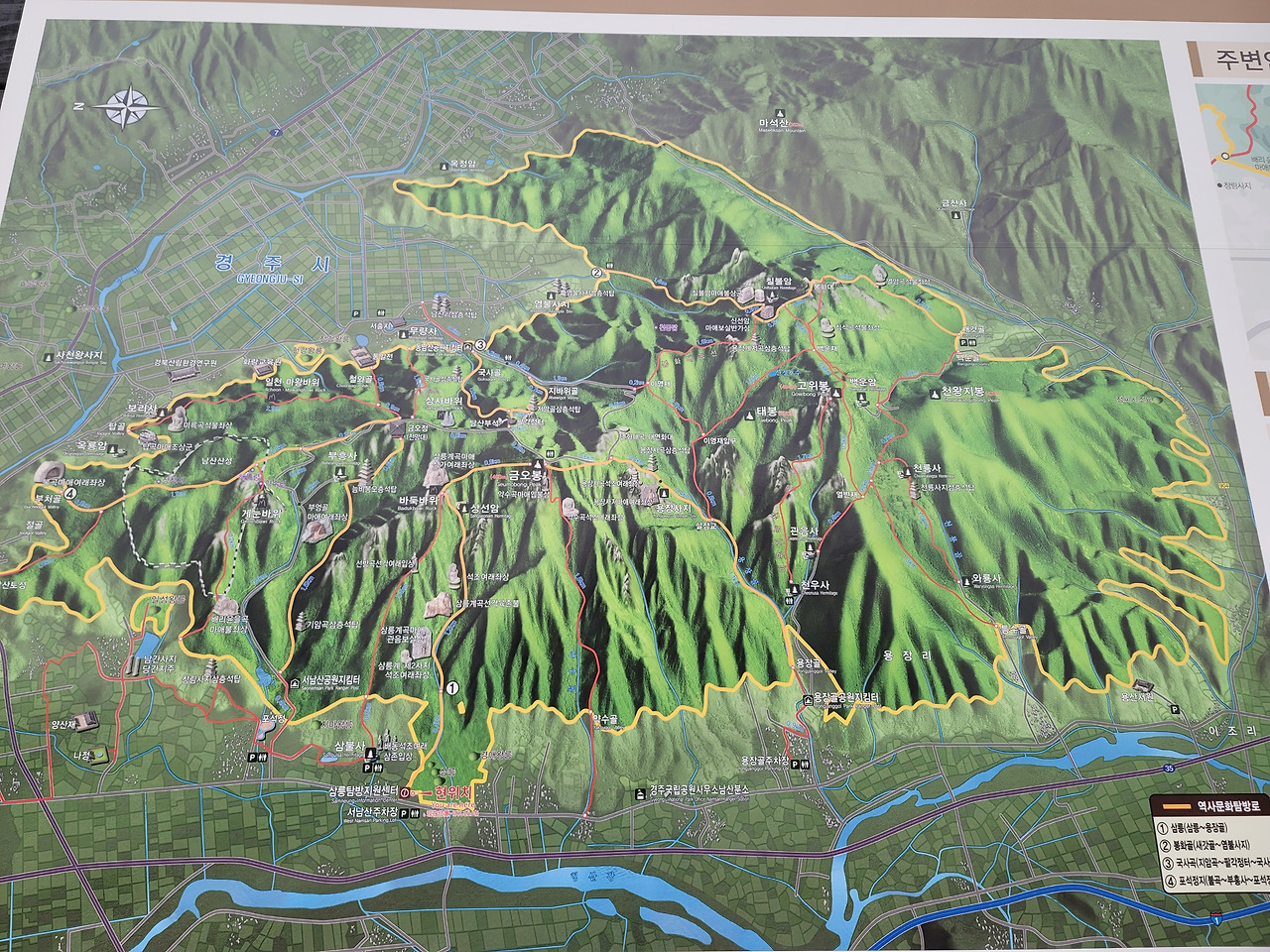 남산은 국보가 1점, 보물이 12점, 절터가 147곳 등 선사유적지까지 그 현황을 살펴보면 무려 694개에 이르는 유적과 유물이 숨어있는 노천 박물관이다. 신라시절 남산에 있는 사찰은 150군데가 넘었다고 한다. 그래서 밤에 남산을 보면 법당 안 촛불들로 인해 은하수를 보는 듯했다고 한다.