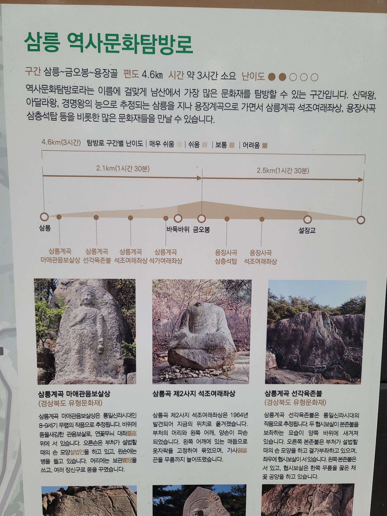 남산에는 다양한 코스가 있는데 내가 오늘 오른 코스는 남산 탐방의 가장 대표적인 코스로 삼릉에서 시작해서 용장사지까지 이어지는 서남산 일주코스다. 삼릉 역사문화탐방로라고 불리기도 하는데 남산에서 가장 많은 문화재를 탐방할 수 있는 구간이다. 편도 4.6km로 내 걸음 기준으로는 14000보 가까이를 걸었다.