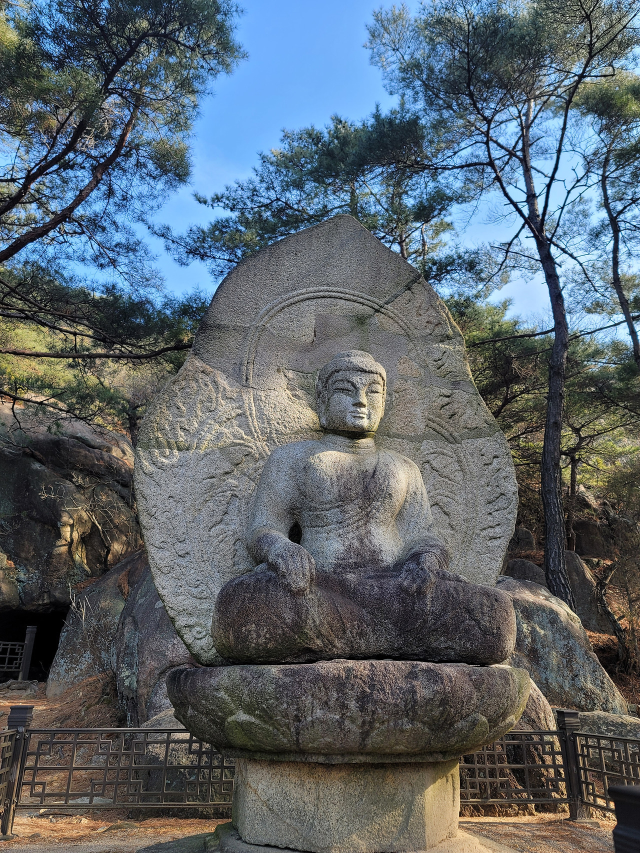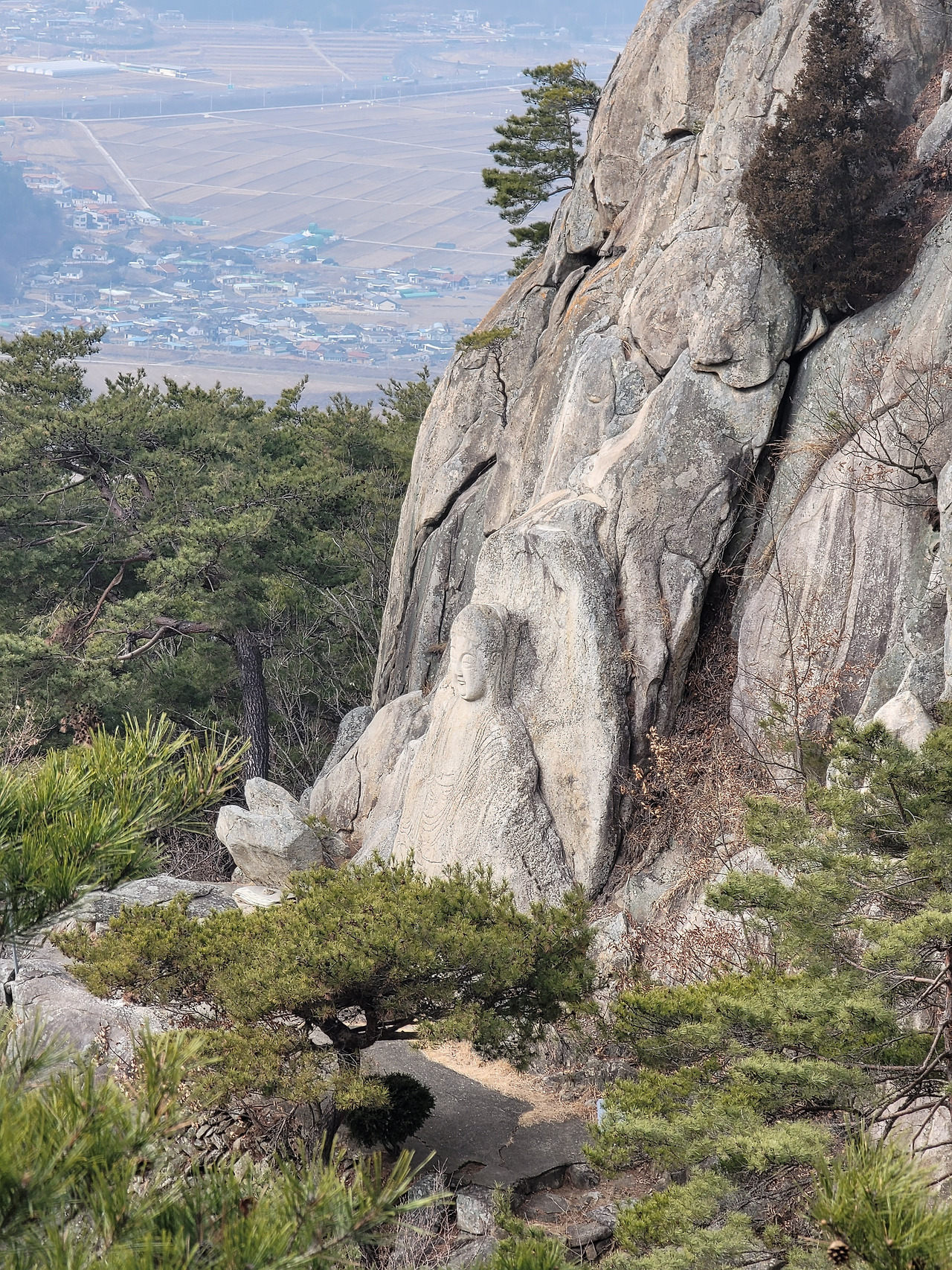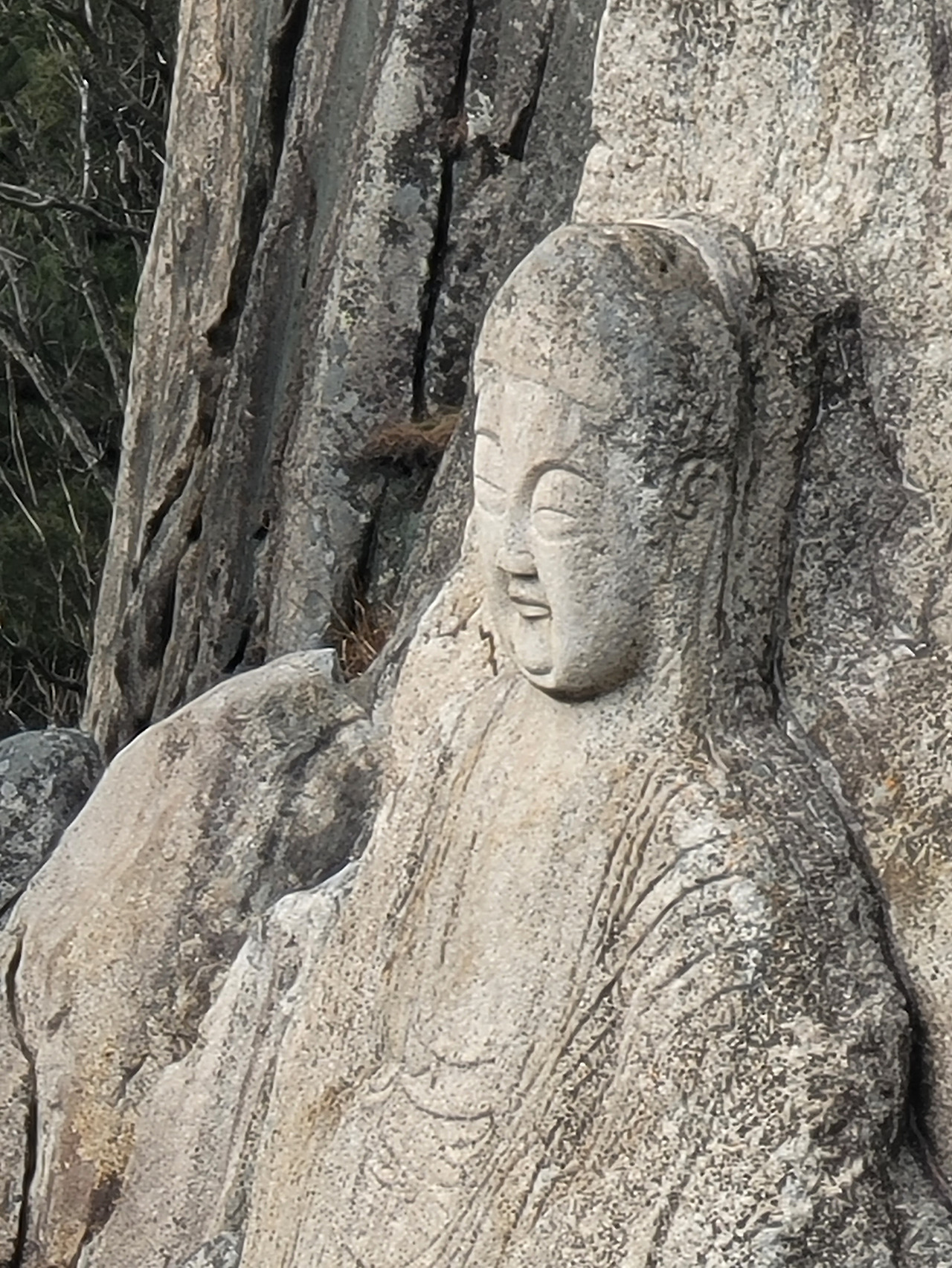 바둑바위를 지나 산에 취해 천천히 걷다 보면 기이한 암석들이 어우러진 곳에 도착하고, 오른쪽으로 눈을 조금 돌리면 삼릉계곡 마애석가여래좌상을 만날 수 있다. 남산에서 가장 높은 곳에 새겨진 마애불인데 높이가 6m에 달한다. 어떻게 저런 곳에 불상을 만들 수 있었을지 상상이 되지 않는 곳에 불상이 존재감 있게 자리하고 있다. 마치 뒤에 있는 거대한 암석들의 일부인 마냥 아래를 굽어 보고 있는 마애불. 마치 한국지폐에 인쇄된 율곡 이이의 눈처럼 가늘고 눈아랫부분이 두툼한 선비의 눈처럼 인간적인 얼굴을 하고 있다. 그러나 그 형체와 분위기, 크기와 위치는 전혀 인간적이지 않고 이 세상 것이 아닌듯하여 또 그 부조화가 예사롭지 않다.