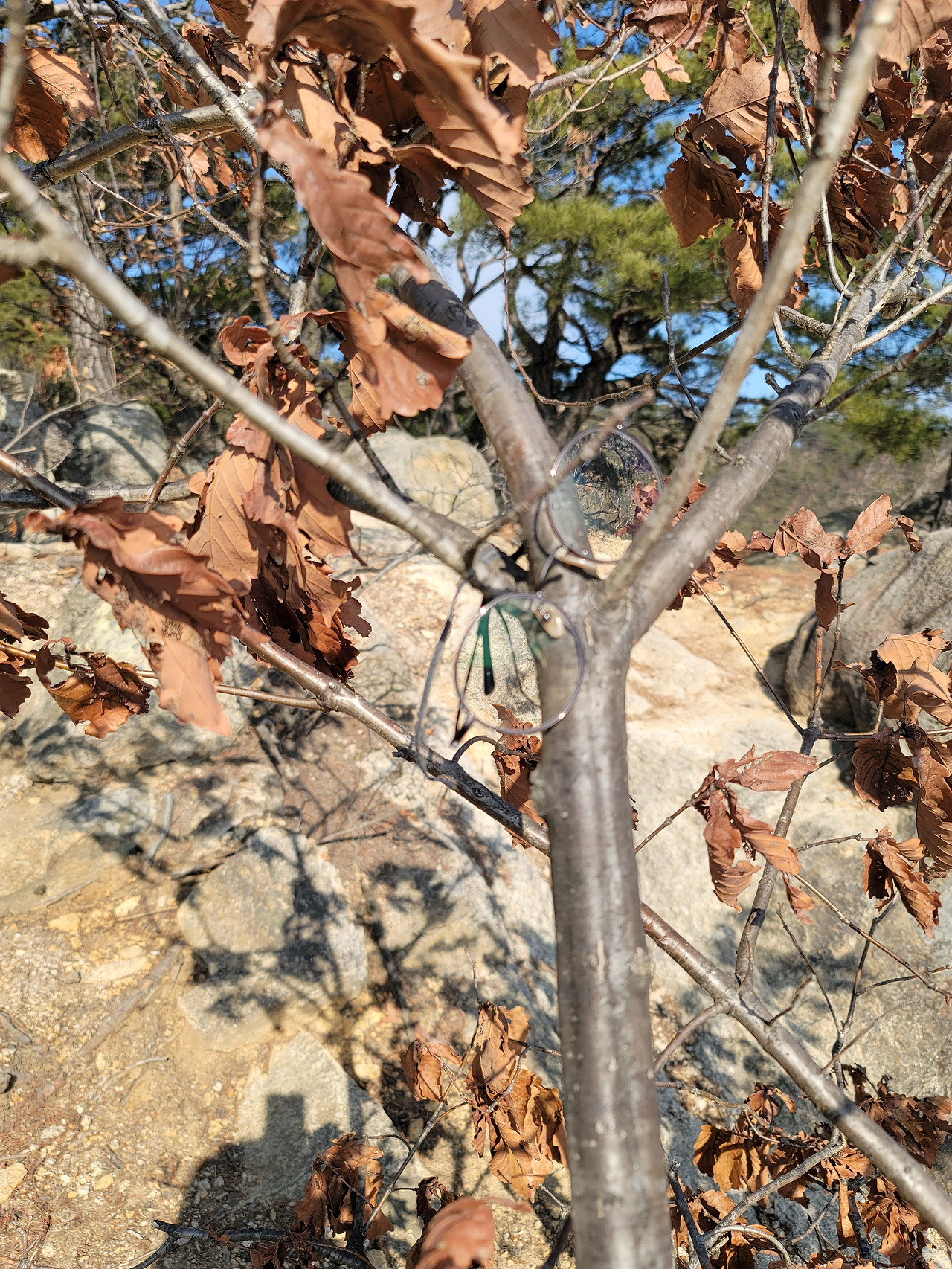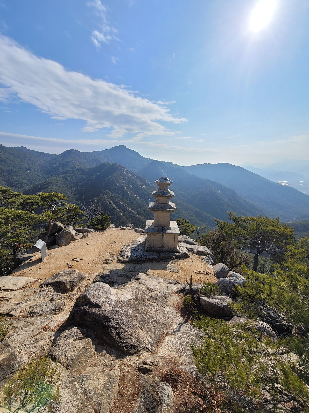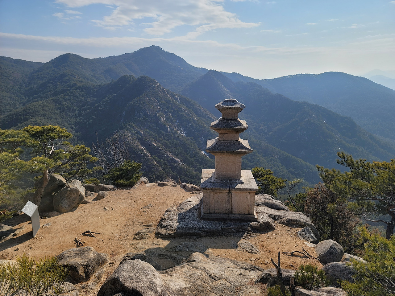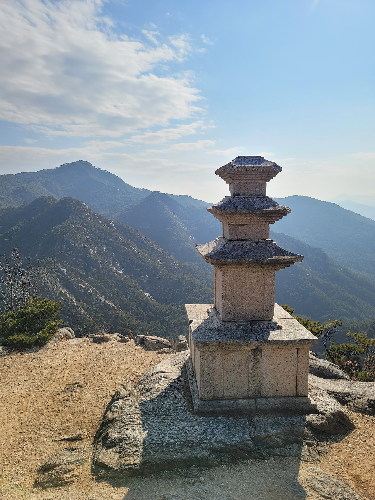 남산의 정상 금오봉에서 잠시 숨을 고른 후 하산을 시작한다. 그러나 아직 남산의 하이라이트이자 이번 경주에서 내가 만난 가장 숨 막히게 아름답다고 여긴 풍경이 아직 남아있었다. 바로 남산 용장사곡 삼층석탑이다. 너른 터에 자연암석을 기반으로 우뚝 서 있는 삼층석탑. 이 석탑을 그냥 평지의 절 마당 앞에서 마주쳤다면 나는 이렇게 큰 감동을 받지 못했을 것이다. 그러나 이 탑은 평범한 평지가 아닌 아주 높은 산 절벽 위에 햇빛을 받으며 서 있다. 그리고 탑 앞으로는 산봉우리들이 탑보다 더 낮게 연이어 마주하고 있다. 마치 인간의 몸처럼 절벽 위에 서 하늘과 햇빛을 전신으로 맞이하고 있는 삼층석탑. 그의 뒷모습은 정말 한 사람의 인간을 보는 듯 생명감 있다. 범접할 수 없는 아우라 풍기는 해탈한 스님인 것처럼 서 있는 탑의 몸. 그 몸이 전해주는 기운이 강해 나는 어지러울 정도였다. 누군가는 이 탑을 보고 너무나 감동한 나머지 눈까지 놓고 산을 내려간 듯 나무 위에 덜렁거리는 안경이 남아있었다.