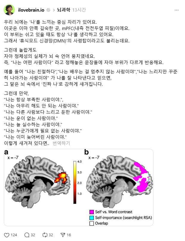 그런데 놀랍게도 자아 정체성의 실체가 뇌 속 언어 뭉치였네요. 즉, “나는 어떤 사람이다” 라고 정해놓은 문장들에 자아 부위가 다르게 반응해요.