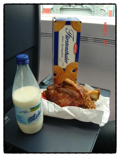내 삶의 시에스타와 같은 여행은 그때마다 즉흥적으로 스케줄이 변경되기도 했다. 퓌센을 당장 보고 싶었기에 뮌헨행 기차를 일찍 타게 되었다. 뮌헨은 '옥토버페스트' 중이라 너무 복잡해서 퓌센을 먼저 다녀오려는 이유도 있다. 아침 겸 점심으로 한국의 족발과 비슷한 돼지다리구이인 ‘슈바인스학세’를 3.6유로에 샀다. 그리고 2.45유로짜리 과자와 우유를 곁들여서 먹으면서 뮌헨으로 향했다.