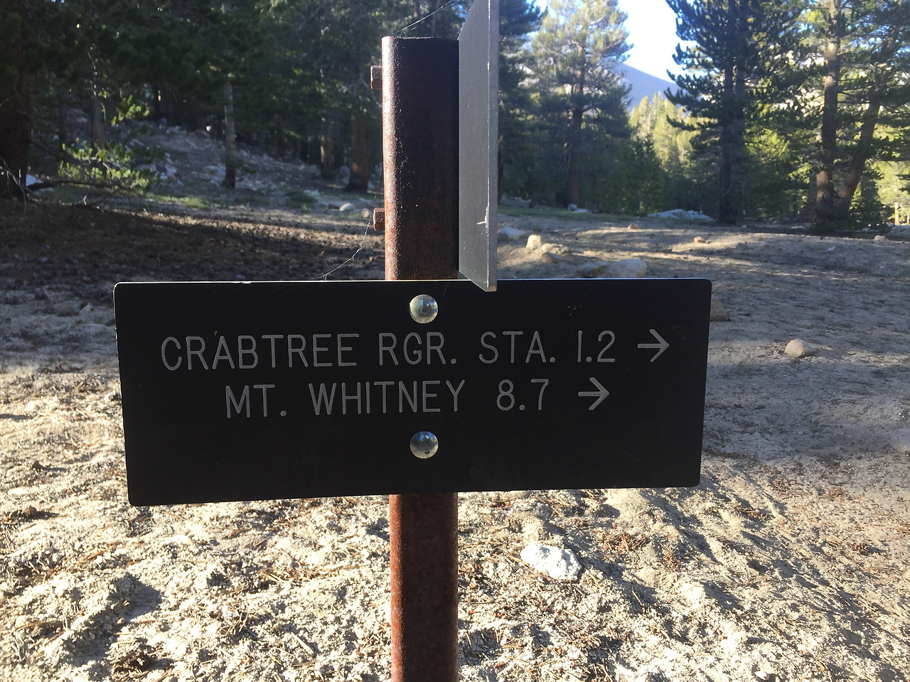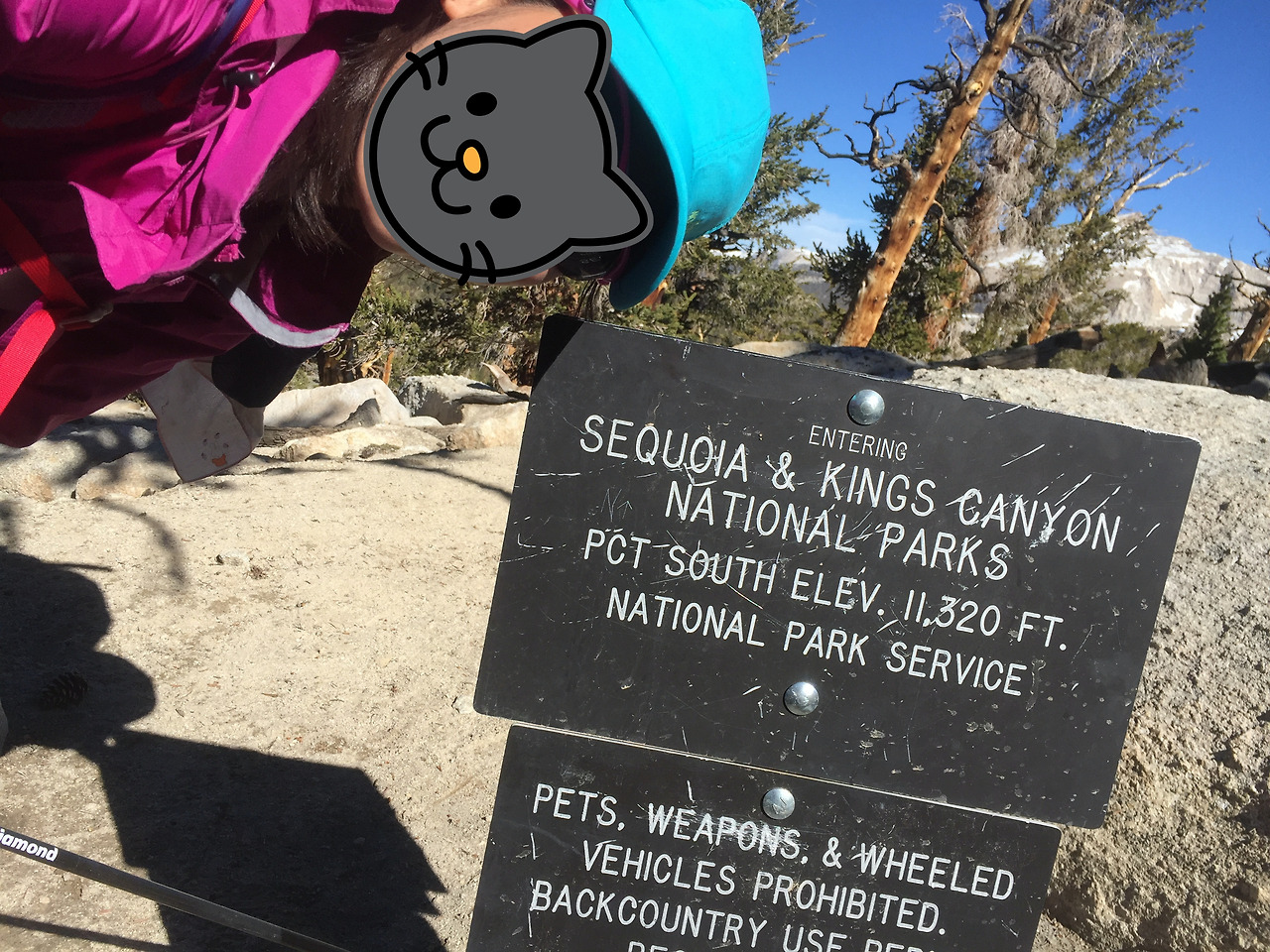 존 뮤어 트레일은 국립공원 3 군데를 지나간다. 나는 원래 시작점보다 50 km 남쪽인 데쓰밸리 (Death Valley)에서 시작했기 때문에 총 국립공원 4 군데를 지나가게 됐다. 이 날 입성한 곳은 세콰이어 (Sequoia), 킹스 캐년 (Kings Canyon) 국립공원이다. 들어가는 입구에 이정표가 있는데 고도가 약 3450미터이다. 이 전날부터 계속 오르막에 오르막을 거듭해서 여기까지 왔는데 앞으로도 오르막만 남았다.