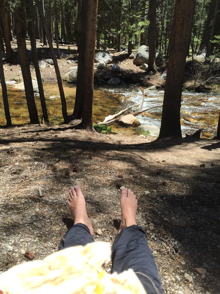 이날의 종착점인 Crabtree Meadow에 다 와갈 때 즈음 이미 해는 저물고 있어서 상당히 추웠다. 고도도 높아졌고. Crabtree Meadow가 코 앞이었는데 그 바로 앞에 시냇물이 콸콸 흐르고 있었다. 아 여기서 또 신발을 벗고 물을 건너야 하다니. 믿고 싶지 않았다. PCT 하이커들 중에 나와 유일하게 속도가 비슷한 하이커인 Blue와 이 냇물 앞에서 한숨을 쉬며 밍기적 거렸다. 저게 얼마나 차가운 지 알거든. 그치만 어쩌겠냐 건너야지. 꾸역꾸역 건너고 나니 먼저 도착해있던 PCT 하이커들이 박수를 쳐줬다. 나에게 쳐준 건 아니고 그들과 함께 걸어온 Blue에게 쳐 준거다.