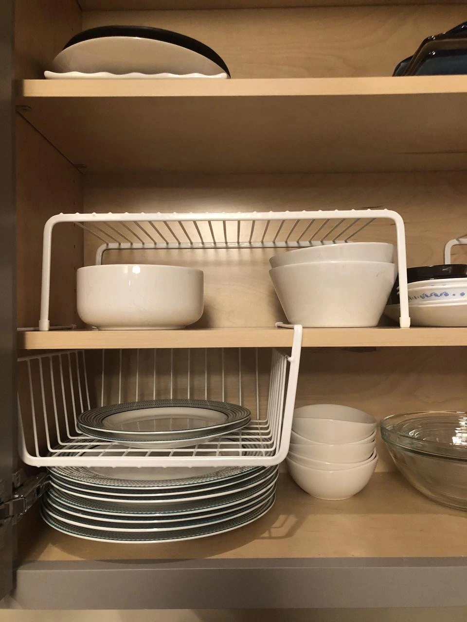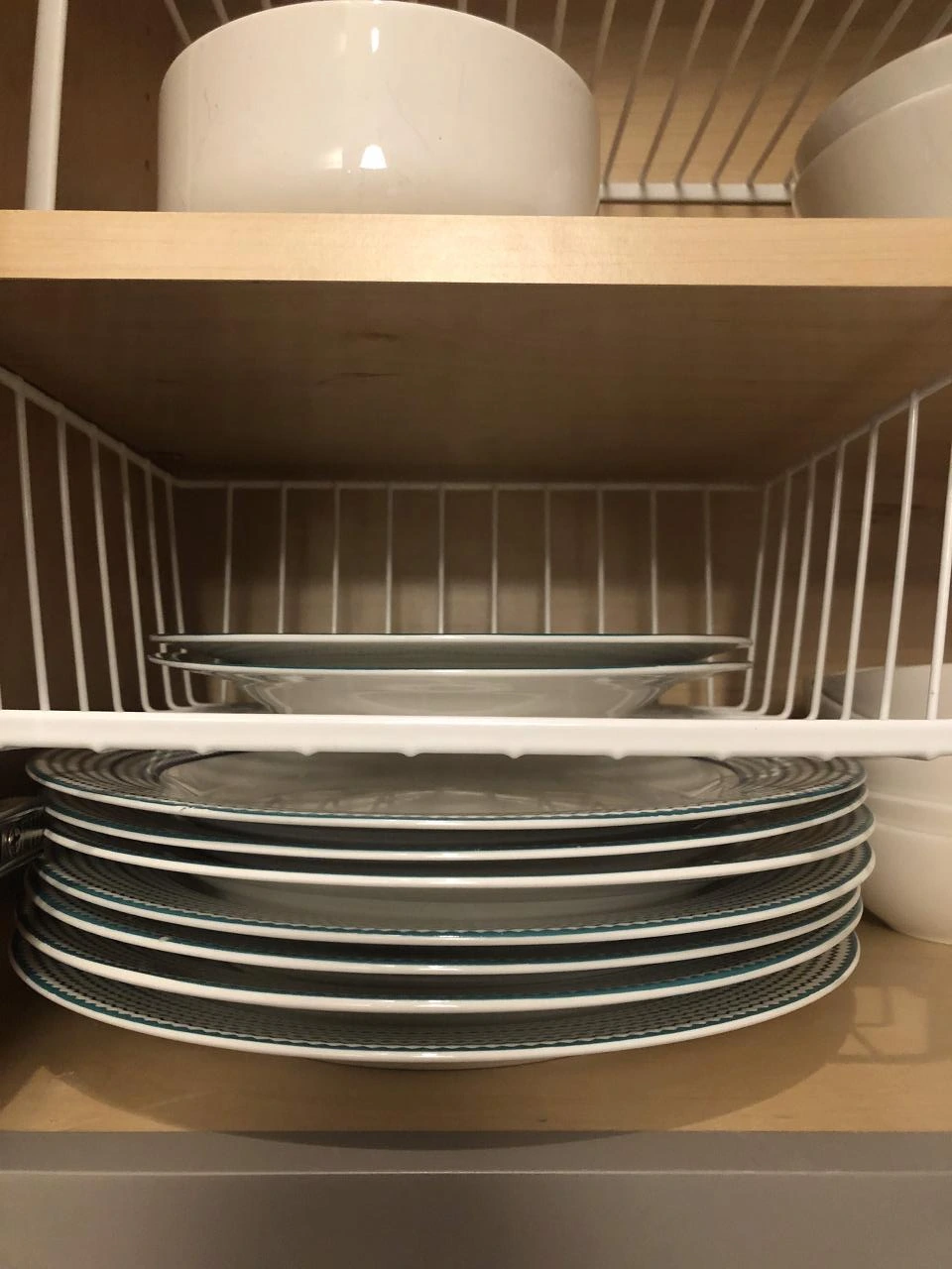 지금까지 돈 쓴 것 중에 정말 가치 있었던 것 중에 하나다. 사진에 보이는 흰색 선반은 그릇 정리 선반 (pantry organizer)이다. 아마 한국에도 분명히 있을 것 같다. 우와 이거 정말 혁명이다. 보통 집에 빌트인 돼 있는 선반은 높이가 꽤 되니까, 그릇을 쌓아 놓게 된다. 그러니까 선반 한 층에 큰 접시를 밑에 두고 그 위에 작은 접시를 또 얹어 놓게 된다. 큰 접시만 꺼낼 때 이게 꽤 불편하다. 맨 위에 있는 작은 접시를 일단 내려놔야, 그 밑에 큰 접시를 꺼낼 수 있기 때문이다. 이게 불편해서 인터넷을 폭풍 검색한 결과, 우리 집 빌트인 선반에 딱 맞는 저런 선반을 찾았다! 정말 너무 편하다ㅠㅠ 저런 선반은 사진처럼 매달려 있을 수도 있다.