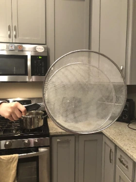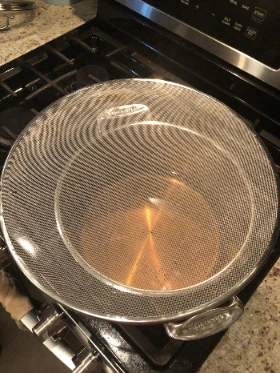 바로 기름 튐 방지망 (oil splatter screen)이다. 난 한국에서 본 적이 없는데 막상 검색하니 나온다. 어찌 보면 생선구이용 그릴 망처럼 생겼다. 뚜껑처럼 완전히 밀폐되는 것이 아니라서, 눅눅해지면 안 되는 기름 요리를 할 때 유용하다. 망으로 되어 있으니 기름 튀는 것을 100% 막아주지는 못한다. 그래도 얼추 반 이상은 기름 튀는 것을 막아준다.