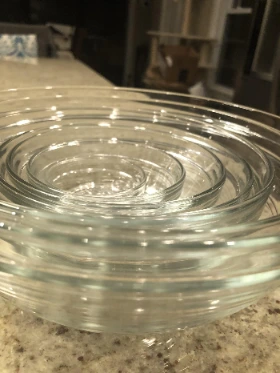 유리 믹싱볼 세트 (glass mixing bowl set)인데 사이즈가 아주 다양해서 좋다. 제일 작은 것은 내가 이미 깨 먹었다ㅠㅠ 내가 선물 받은 이 세트는 용량이 표기되어 있지는 않다. 그리고 뚜껑도 없다. 근데 시엄마가 가지고 있는 거는 용량 표기가 다 되어 있고 (이건 1컵짜리 저건 2컵짜리 이런 식으로) 딱 맞는 뚜껑도 있다. 아마 시엄마가 비슷한 세트를 잘못 알고 보낸 것 같다. 그래도 이쁘니까 계속 쓴다.