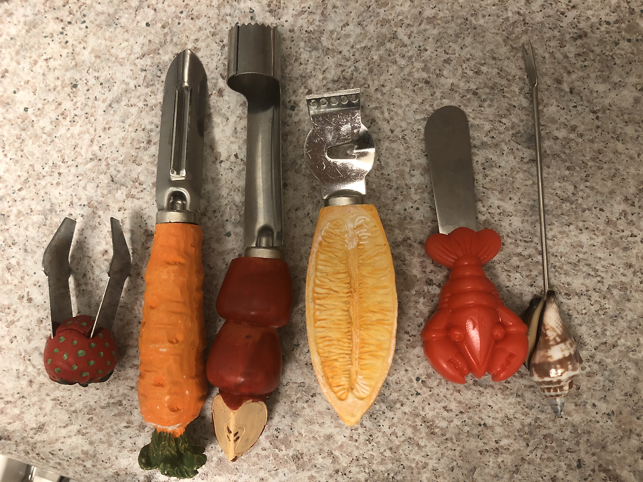 1 딸기 꼭지/심지 따는 집게 (strawberry huller) 저 집게를 꼭지 주변에 쑥 집어넣어서 빼 내면 꼭지와 심지가 빠진다. 그냥 손으로 떼도 되긴 하지만 그러면 심지가 남아서 먹는 데 좀 걸리적거리니까 저걸 쓰나 보다.
