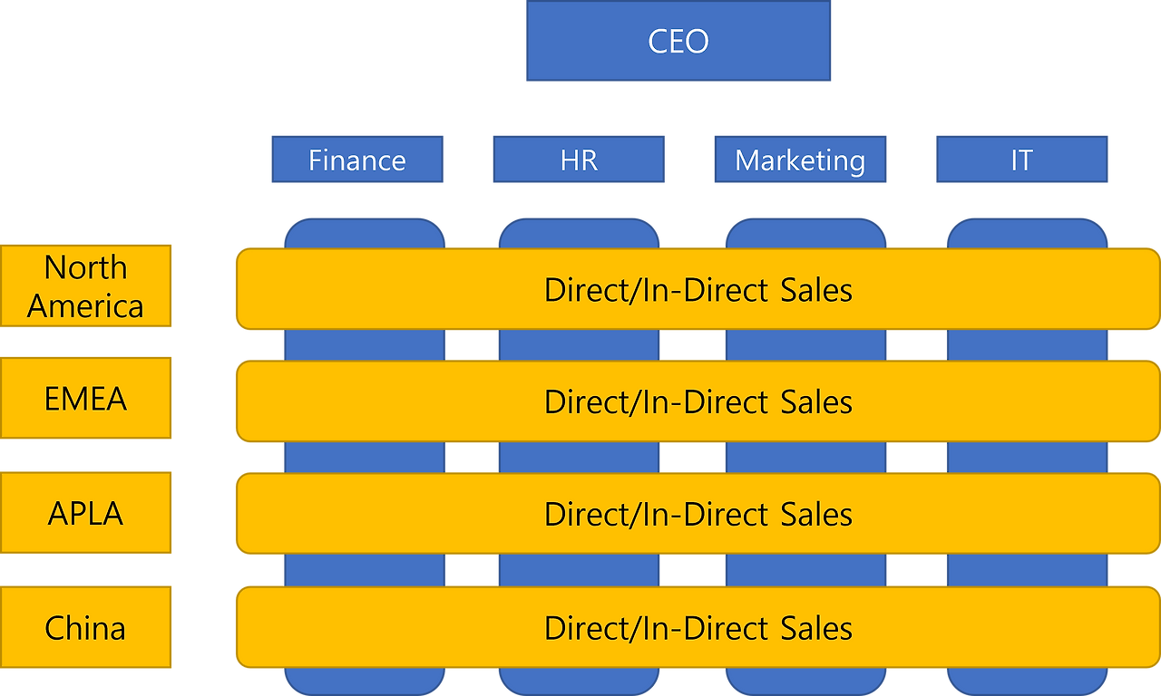 나이키의 조직구조를 보면 대표적인 매트릭스 조직의 모양을 갖고 있다. 사업보고서상 매출 구분에서 알 수 있듯이 가장 크게는 지역별 조직(Geographical Divisional Structure)으로 나뉘어 있다. 전체 매출의 41%를 차지하는 North America부터 유럽과 중동을 합한 EMEA, 그리고 아시아와 남미를 합한 APLA, 그리고 중국으로 나뉘어 있다. 각 지역마다 고객이 많이 다르니 상품기획부터 마케팅, 판매까지 별도의 지역으로 구분하여 운영하고 있다.