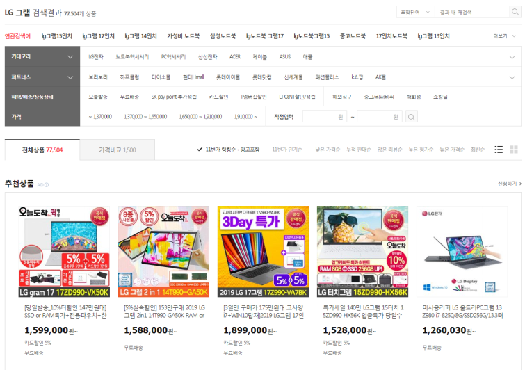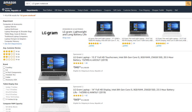 아마존은 자신이 취급하는 상품의 가격을 언제나 최저로 유지하는 원칙이 있기에(로봇에 의해서 가격이 자동 조정된다) 아마존이 관리하는 상품은 대부분 검색의 최 상단에 리스트 된다. 상품의 구색 확보를 위해 구형 모델이나 중고상품이 리스트 되기는 하지만 단순함을 해치는 수준은 아니다. 즉 하나의 상품에 다수의 판매상이 중복하여 경쟁적으로 판매하는 오픈마켓의 모습과는 완연히 다르다. 상품요소의 일부 변형이나 세부사항의 변경, 사은품 증정 등의 수단으로 동일한 상품의 가격이 다양해지는 복잡함을 아마존에서는 찾아보기 힘들다. 그냥 아마존이 제공하는 상품을 구매하는 것이 가장 현명한 선택일 가능성이 크다. 아래 그림을 보면 아마존에서 LG전자의 그램 노트북을 검색한 화면이다. 아마존과 LG전자가 협력하여 간명한 결과를 보여준다.