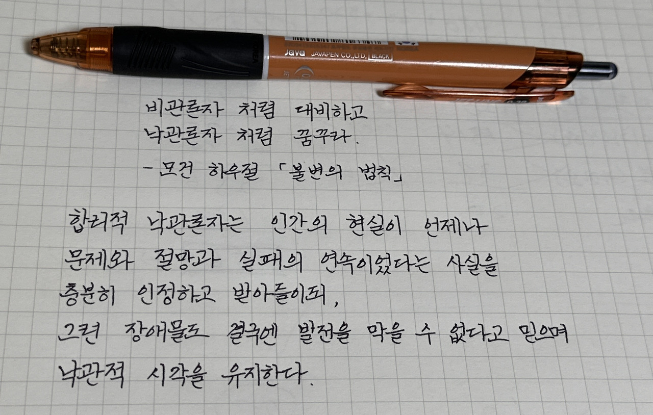 낙관과 비관 이를 적절하게 조화시켜 보자. 합리적 낙관론자. 비관론자 처럼 대비하고 낙관론자 처럼 꿈꾸라. 무엇을 하더라도 비관론자 처럼 대비하고 세우고 낙관론자 처럼 꿈꾸자.