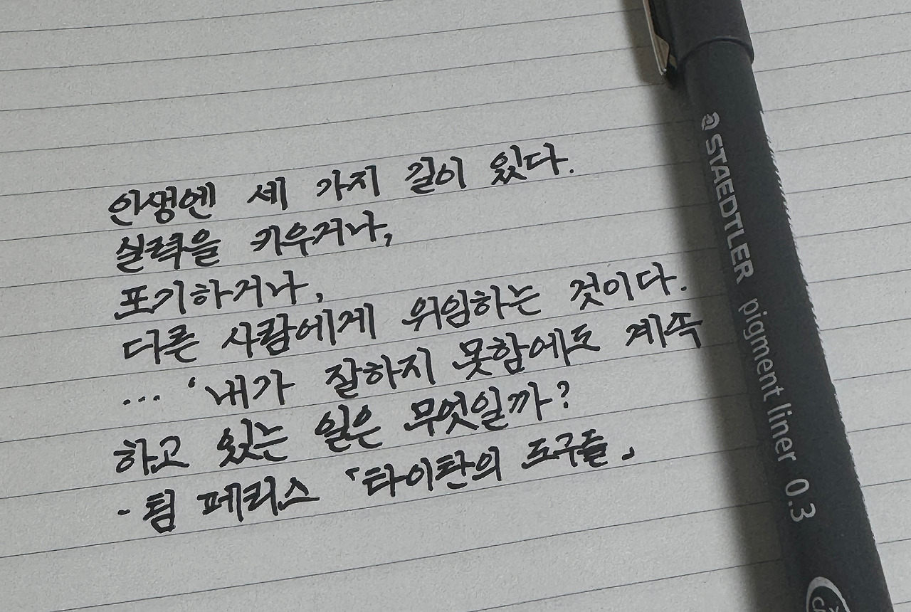 인생엔 세 가지 길이 있다고 하는데, 실력을 키우거나, 포기하거나, 다른 사람에게 위임하는 것, 내가 여전히 잘하지 못함에도 붙잡고 있는 이것들은 어떻게 해야 하는 것인가? 실력을 키워? 포기해? 다른 사람에게 위임은? 세 가지 길에서 종종 생각해 봐야 할 문제이다. 목표를 꿈에 맞게 조금씩 수정해 가면서 나아가보자.