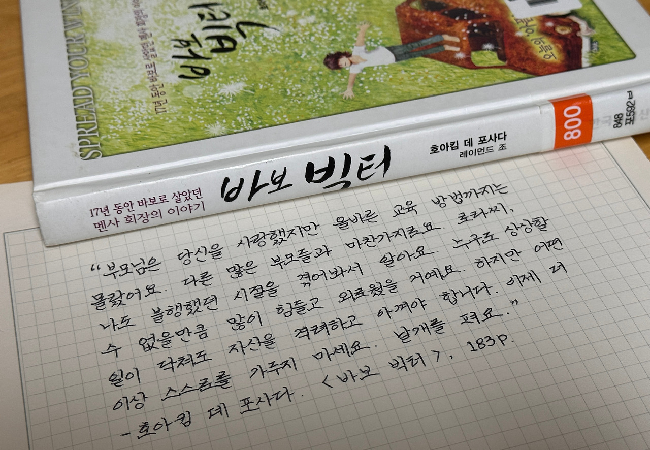 "아버지는 감정을 표현하는 방법을 잘 모르셔. 언제나 너와 가까워지고 싶고 대화를 하고 싶은데 독설이 먼저 튀어나와 버리지. 그렇지만 널 누구보다 사랑하신단다. 예전에 네가 책을 쓴다고 했을 때 기억나니? 그때 아버지가 너한테는 모질게 말했지만, 사실 주변 사람들에게 딸이 작가가 될 거라고 얼마나 자랑했는지 몰라."